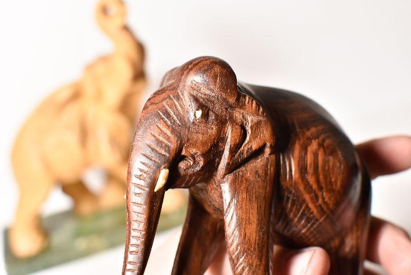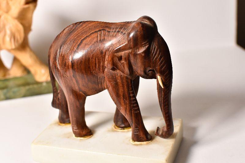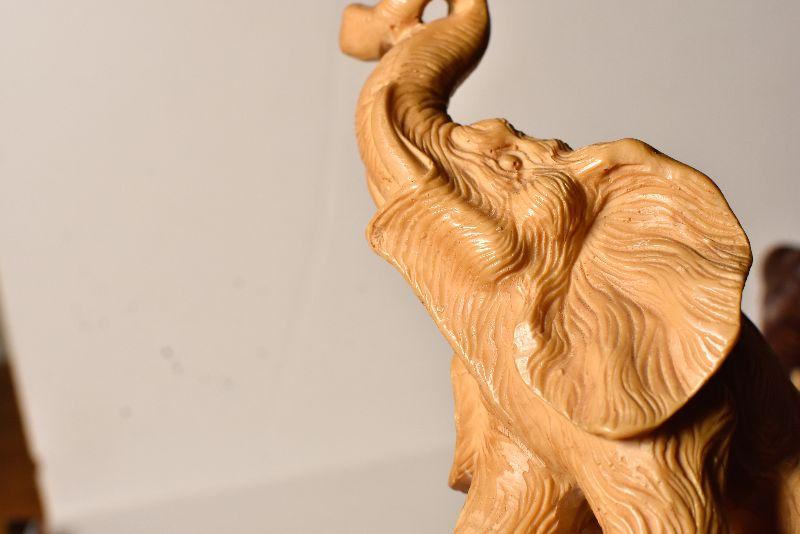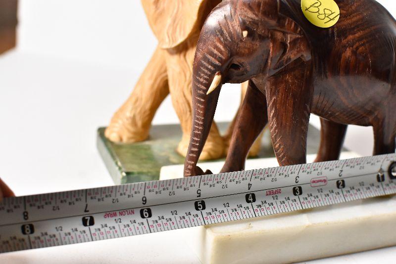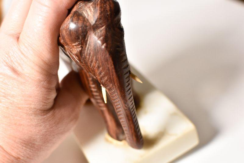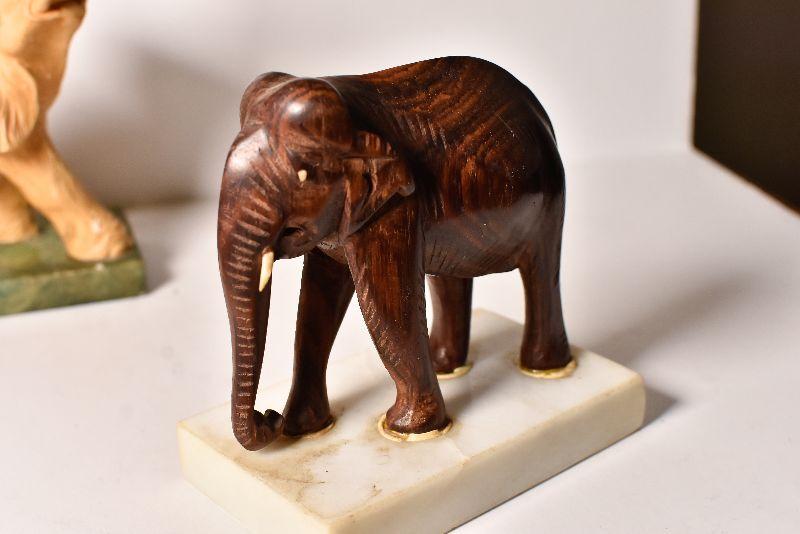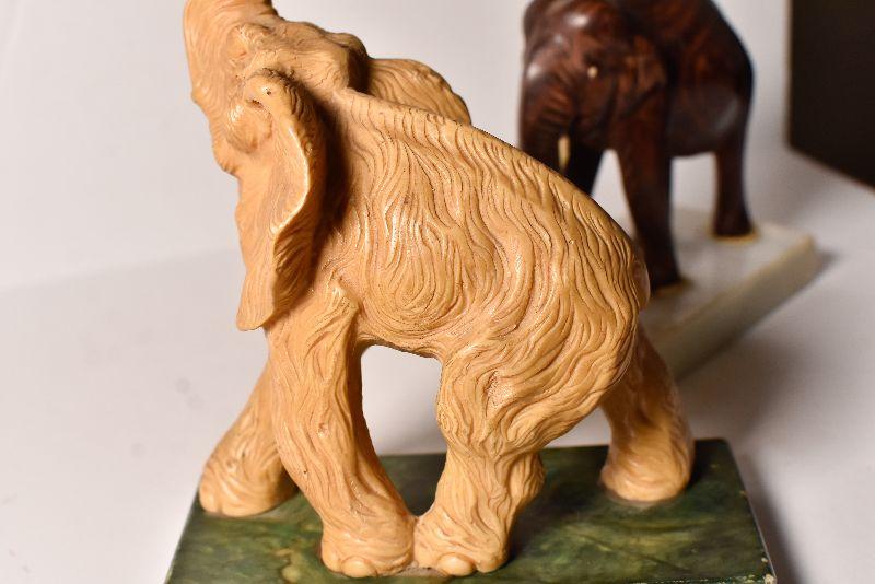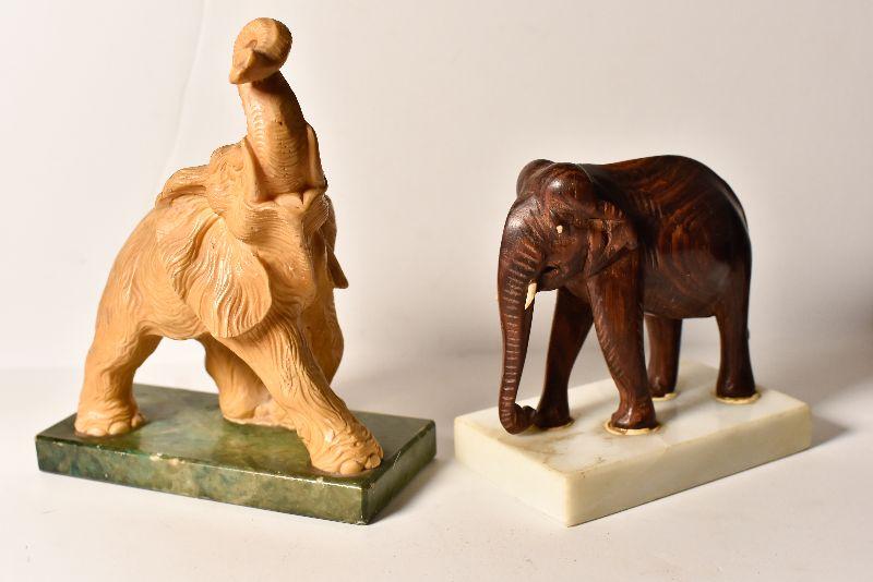 Hand carved, alibaster stone elephant made in Italy, base has chips, and a wooden elephant on stone base.