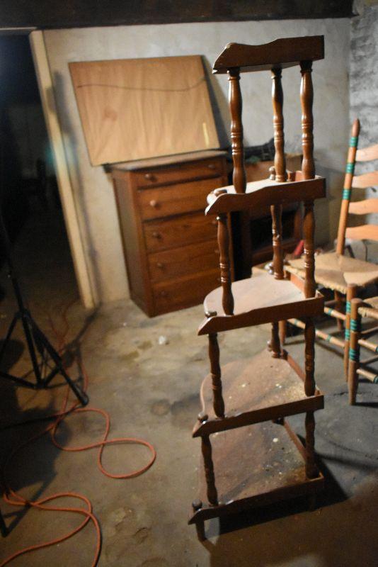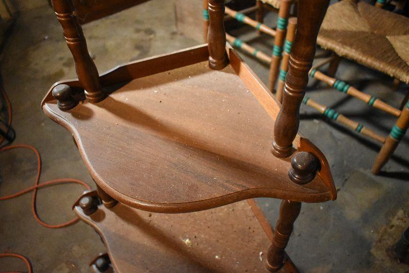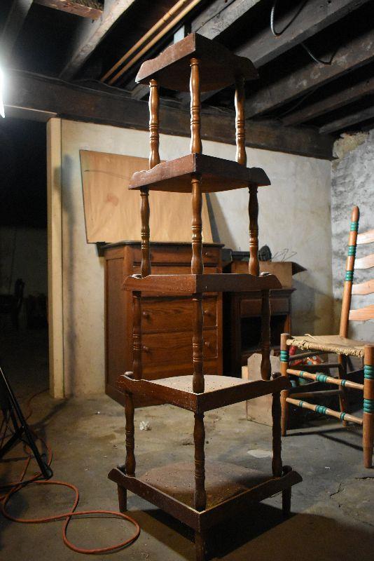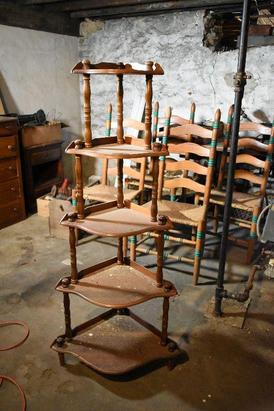 Wooden corner shelf. Needs cleaning. 53 inches tall.