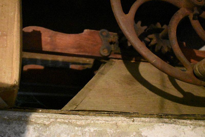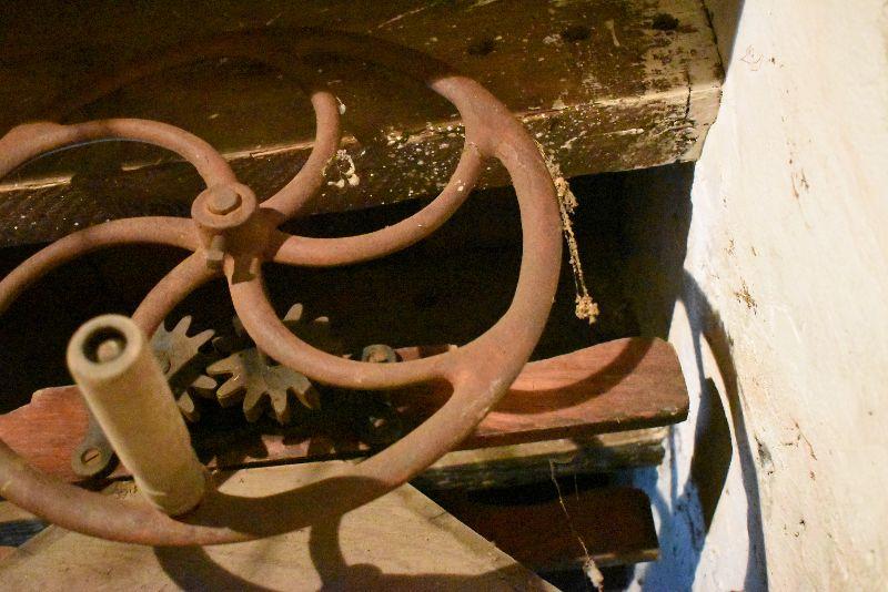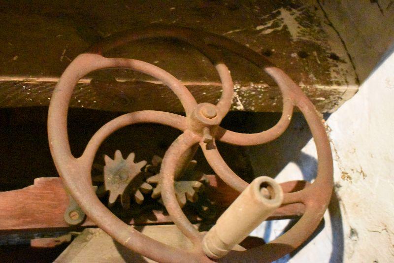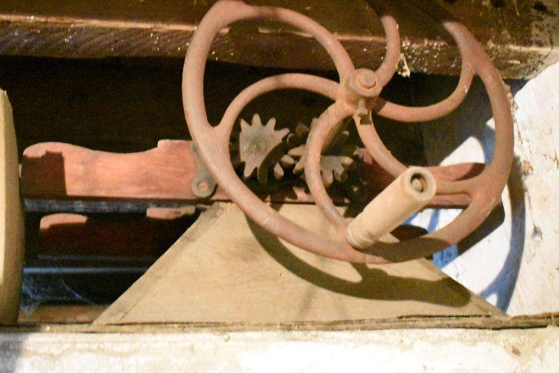 Wooden wine press with iron handle and gears. Nice piece, untested. Would make great decor.