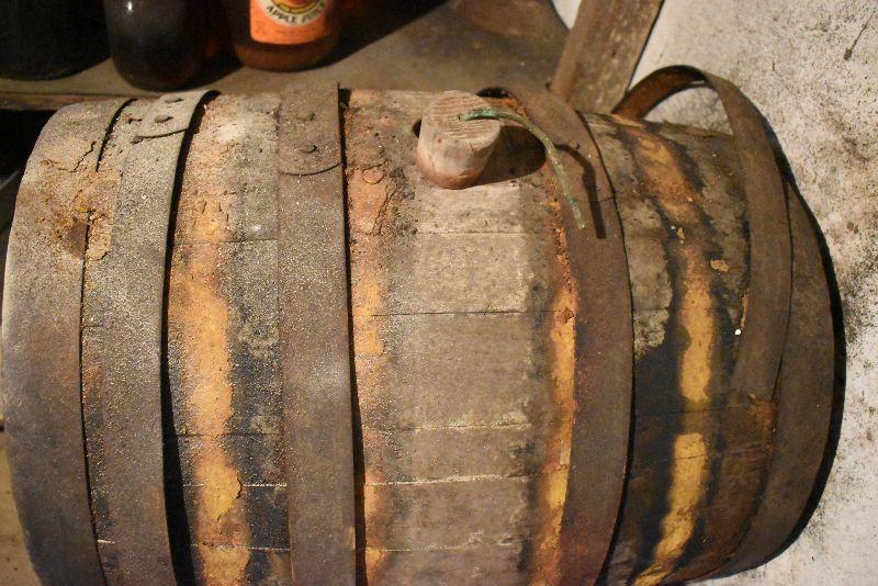 Wooden barrel with iron straps and spigot. See pictures for condition. 17 high across and 23 inches high. Bring help to move from basement.