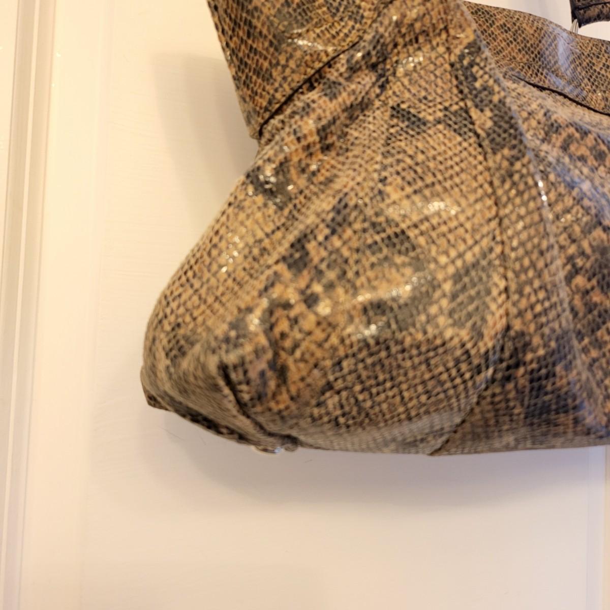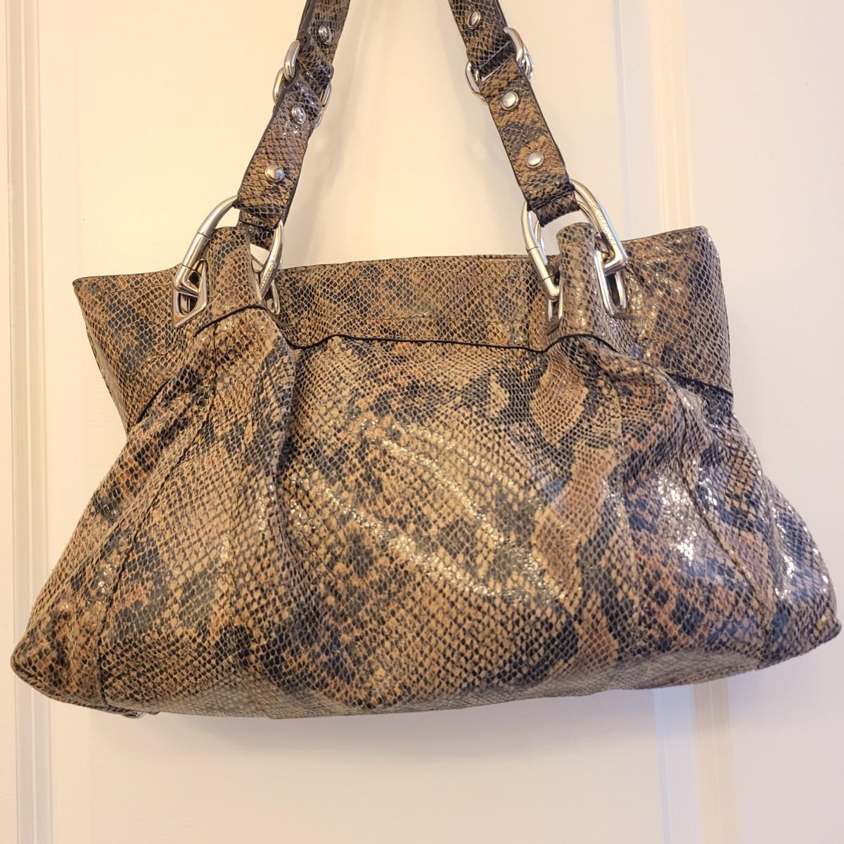 Brown & black genuine leather, snakeskin handbag with animal print interior. Center zipper compartment, two open compartments. Silvertone hardware, double shoulder strap. Magnetic closure. Measures 15" x 12" x 3".