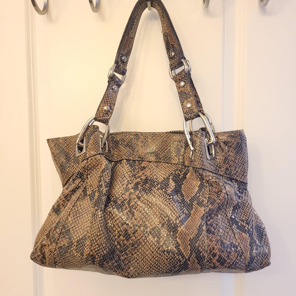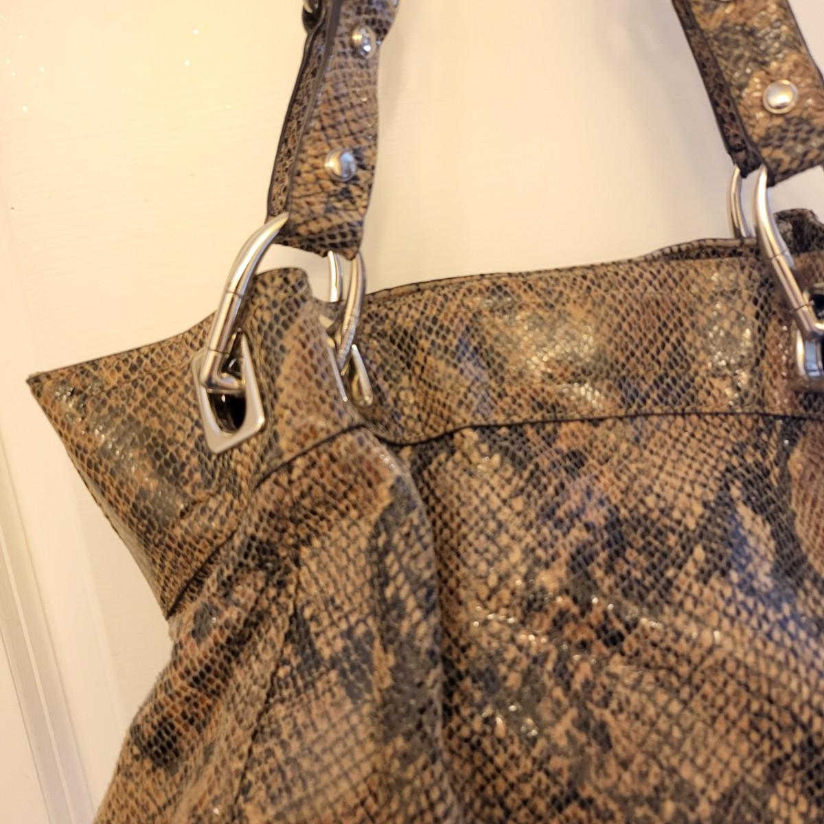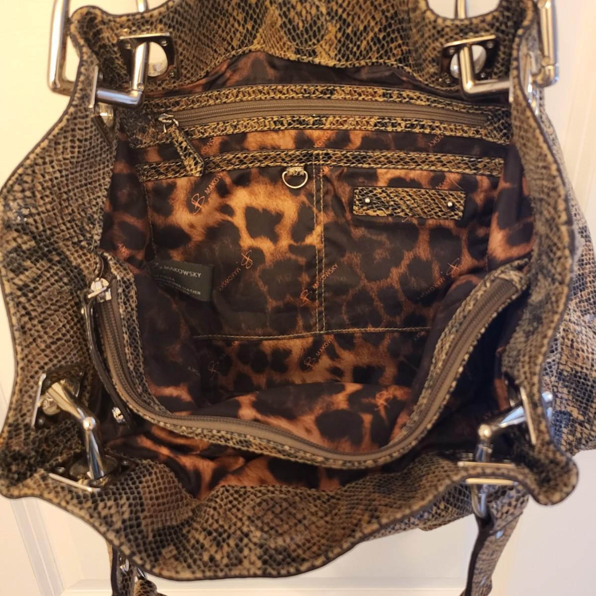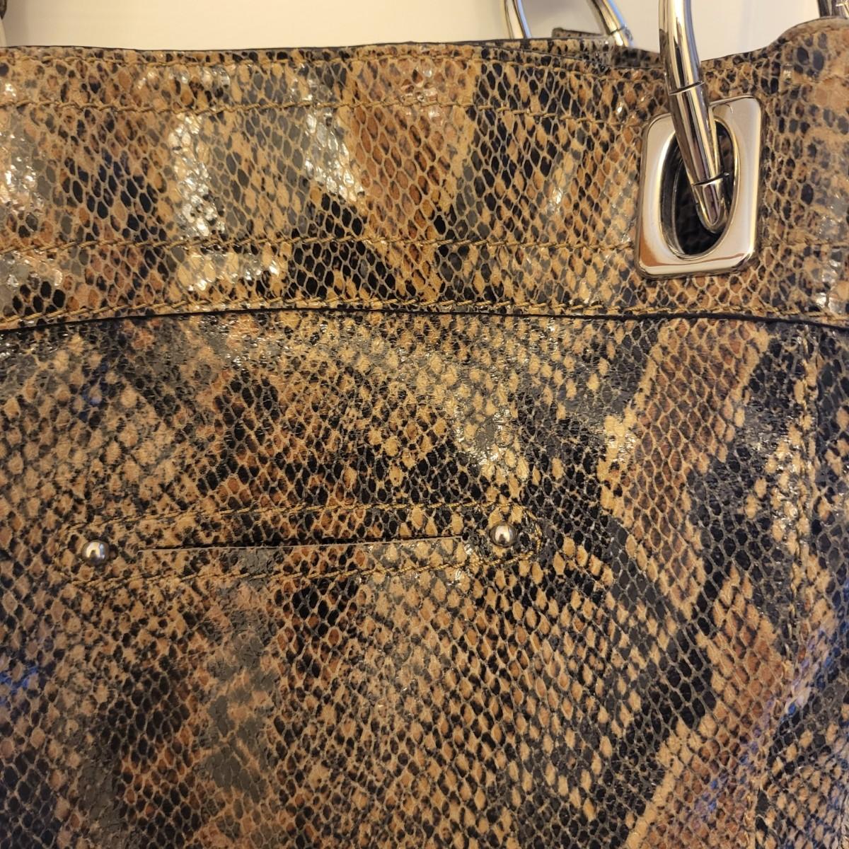 Brown & black genuine leather, snakeskin handbag with animal print interior. Center zipper compartment, two open compartments. Silvertone hardware, double shoulder strap. Magnetic closure. Measures 15" x 12" x 3".