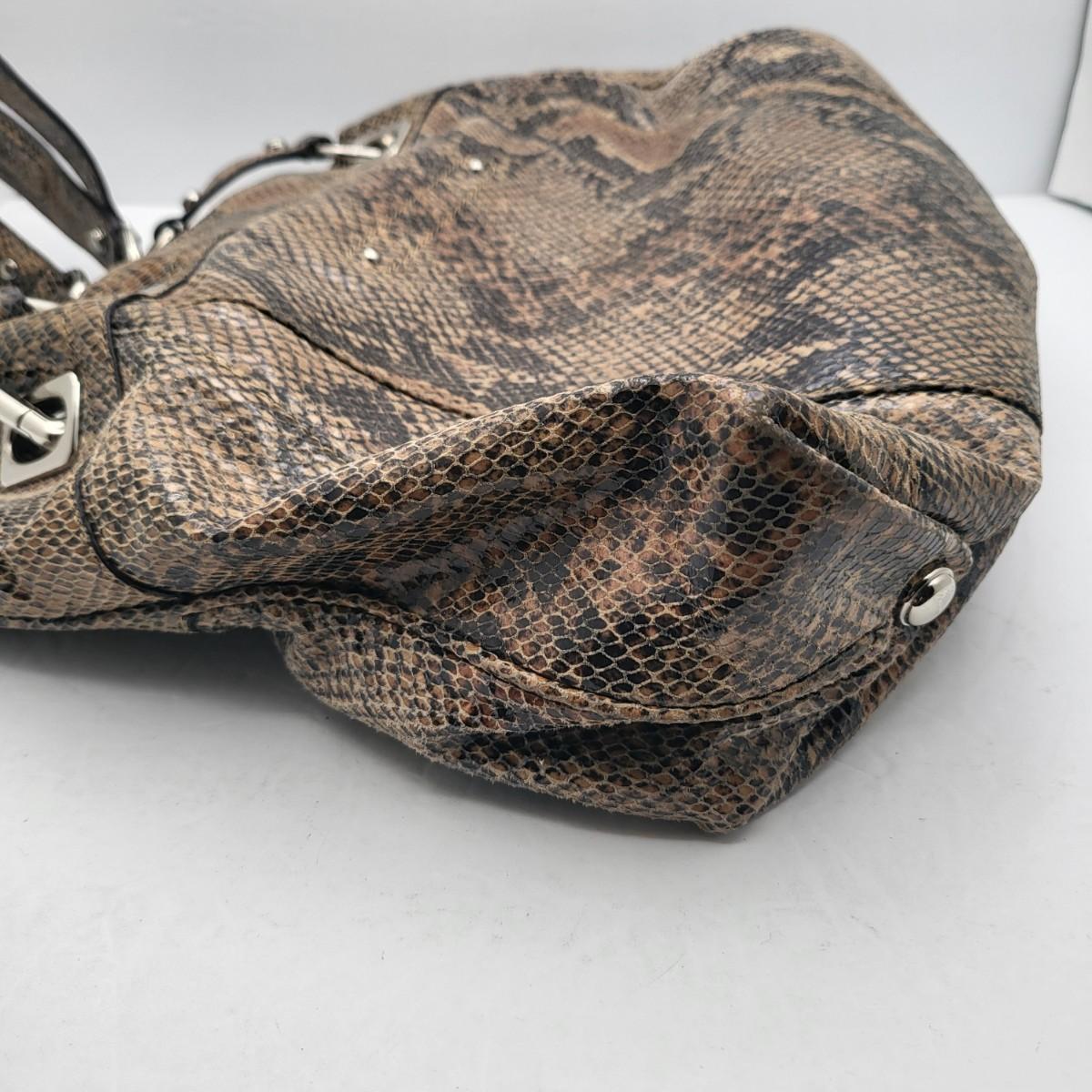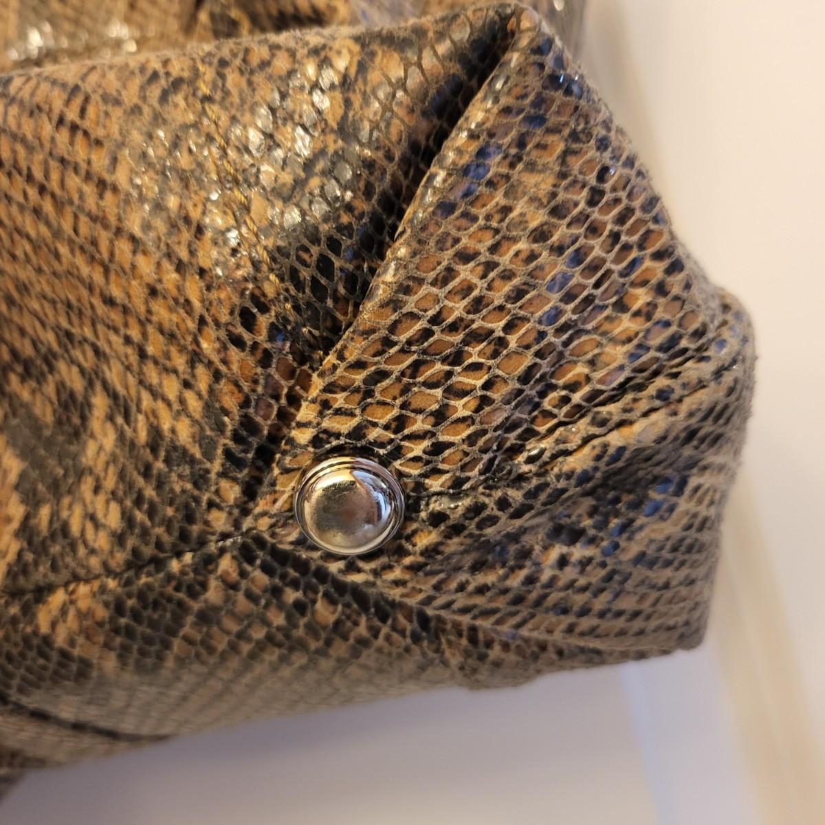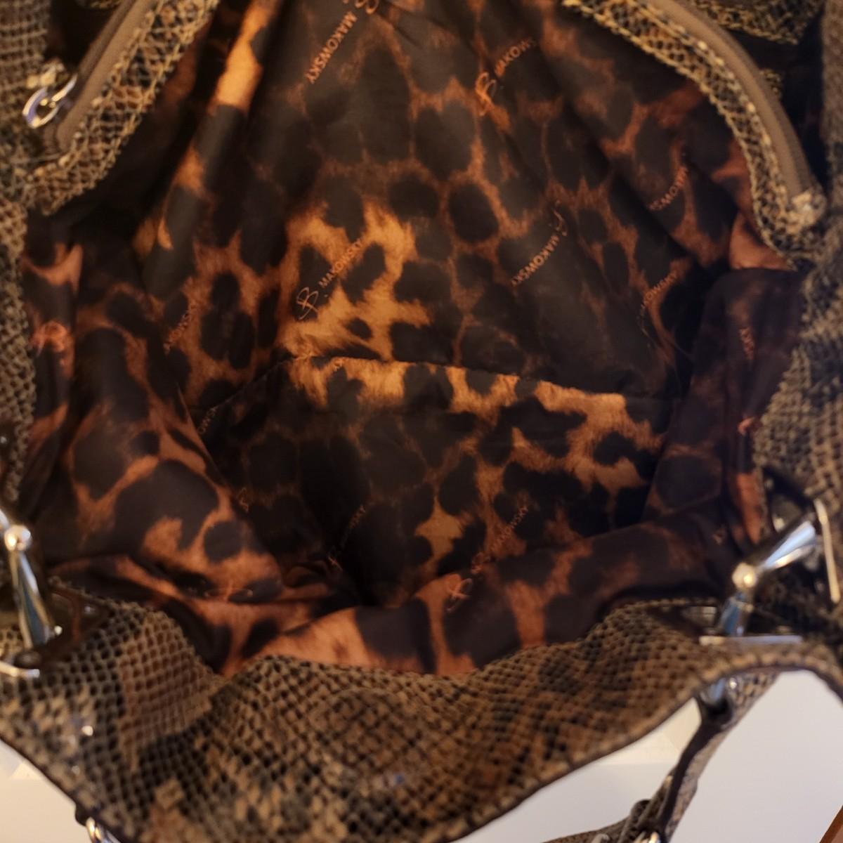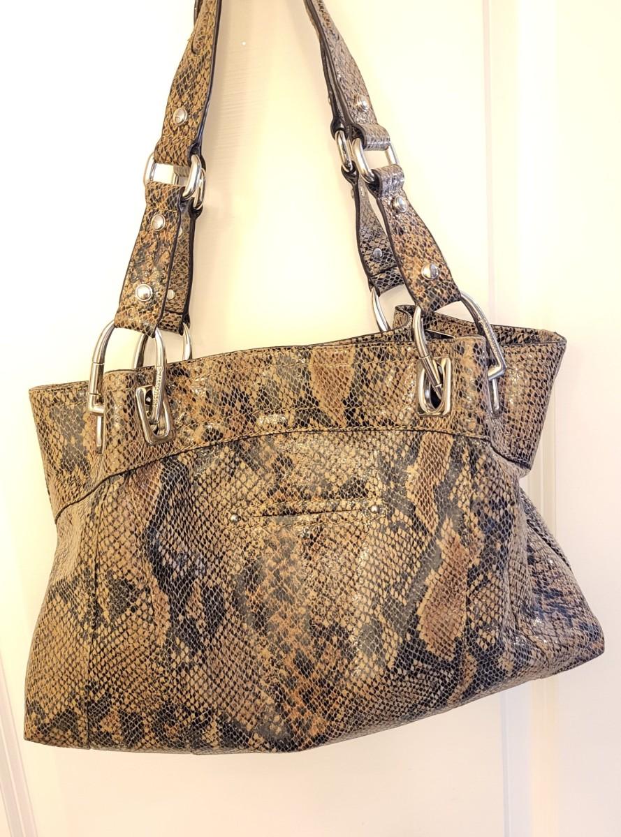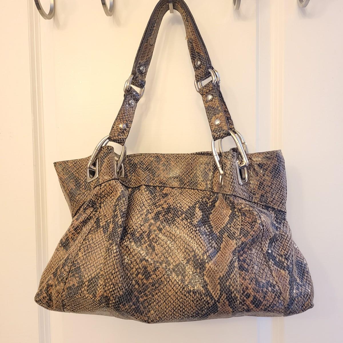 Brown & black genuine leather, snakeskin handbag with animal print interior. Center zipper compartment, two open compartments. Silvertone hardware, double shoulder strap. Magnetic closure. Measures 15" x 12" x 3".