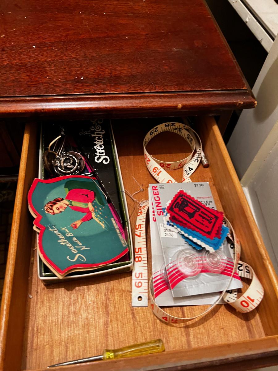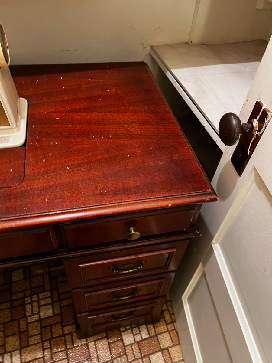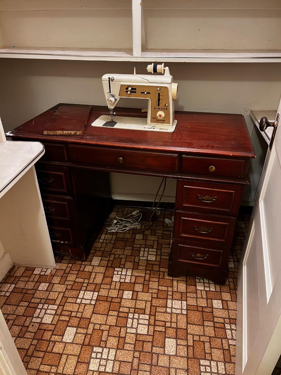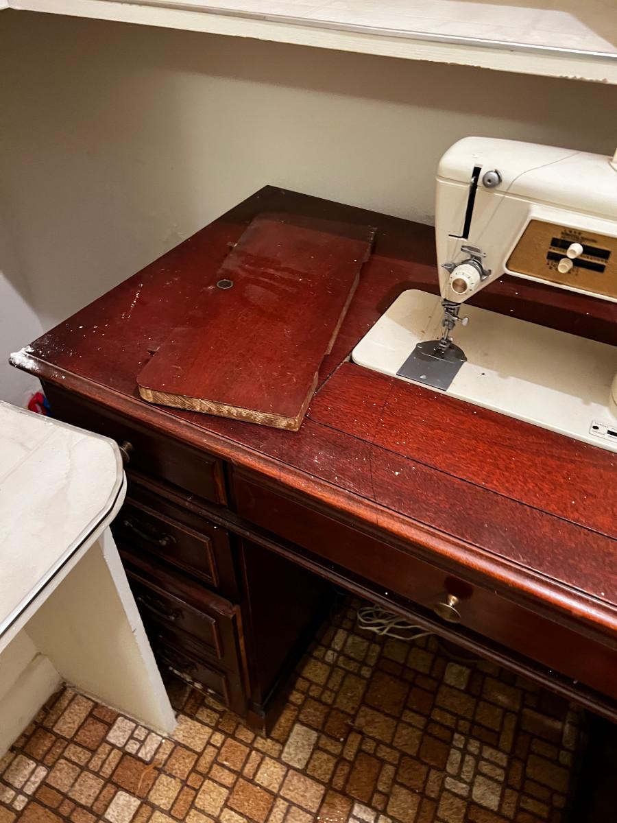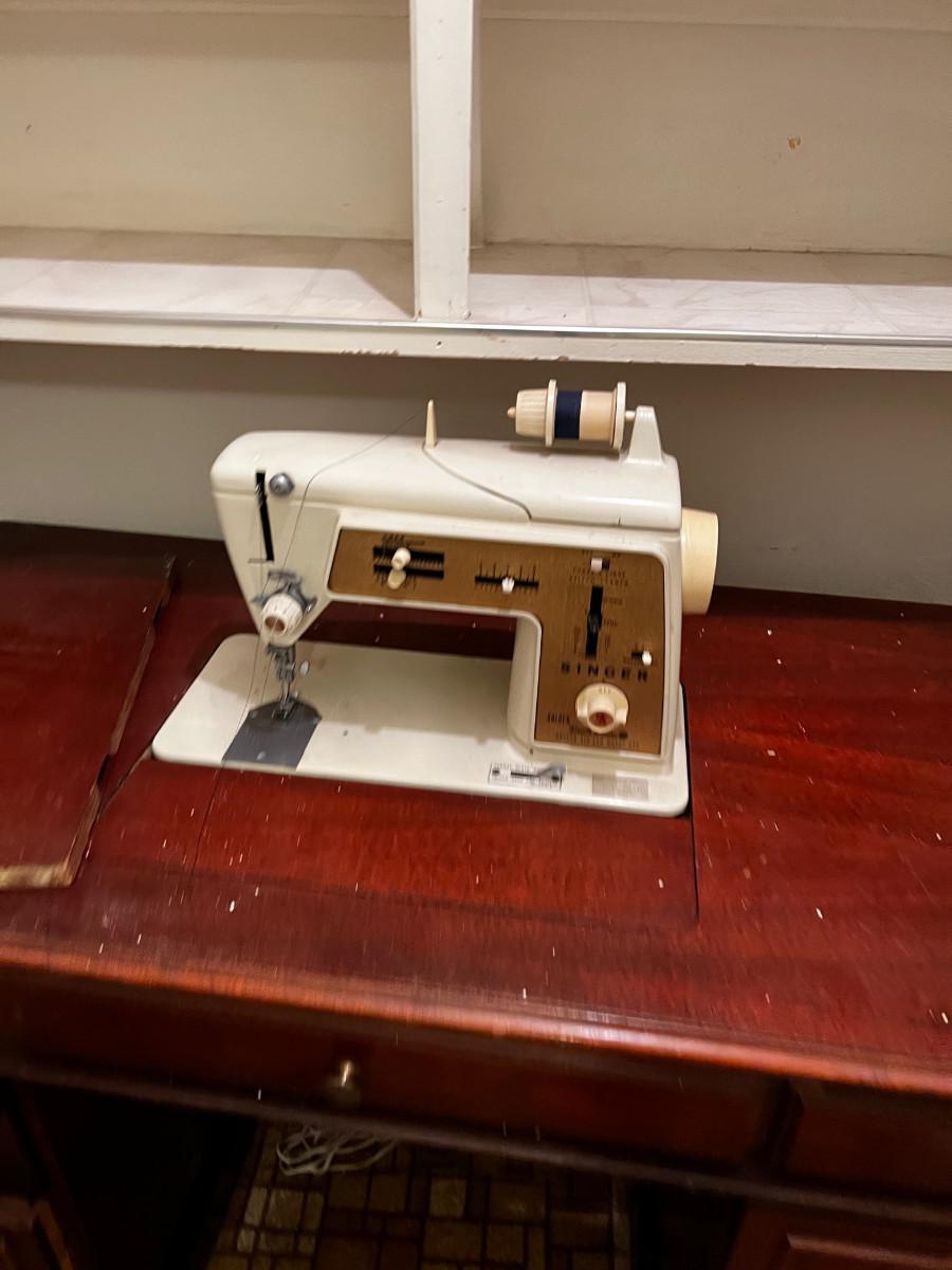 B - Singer Sewing Machine in Desk Top Cabinet.