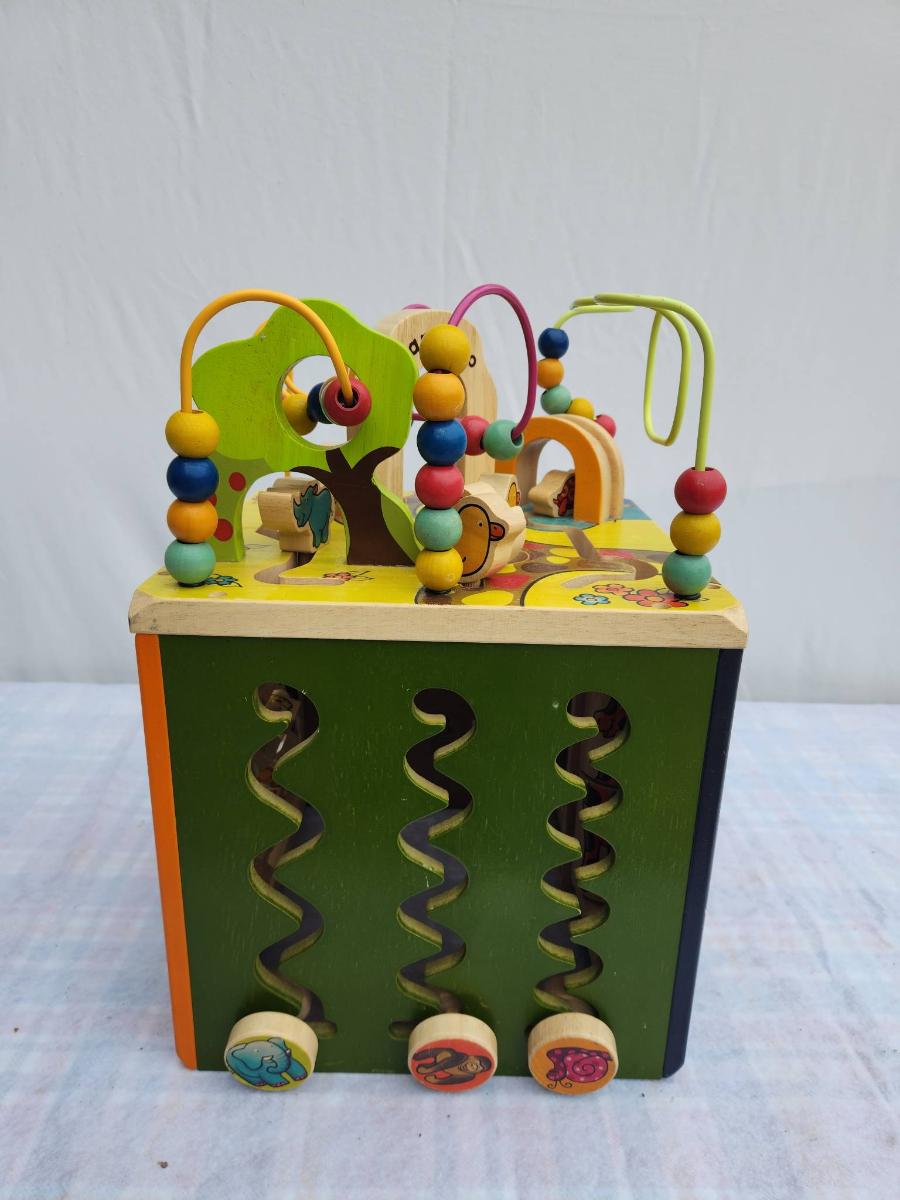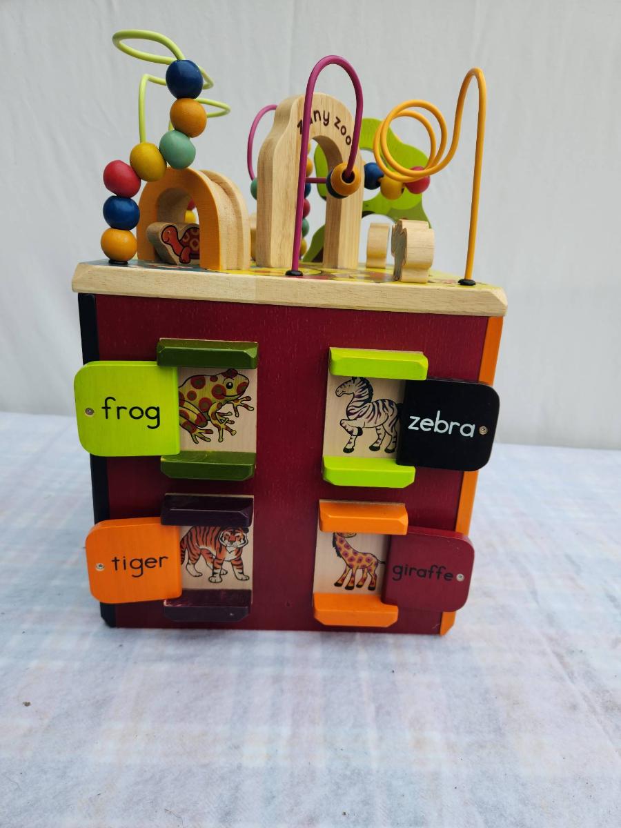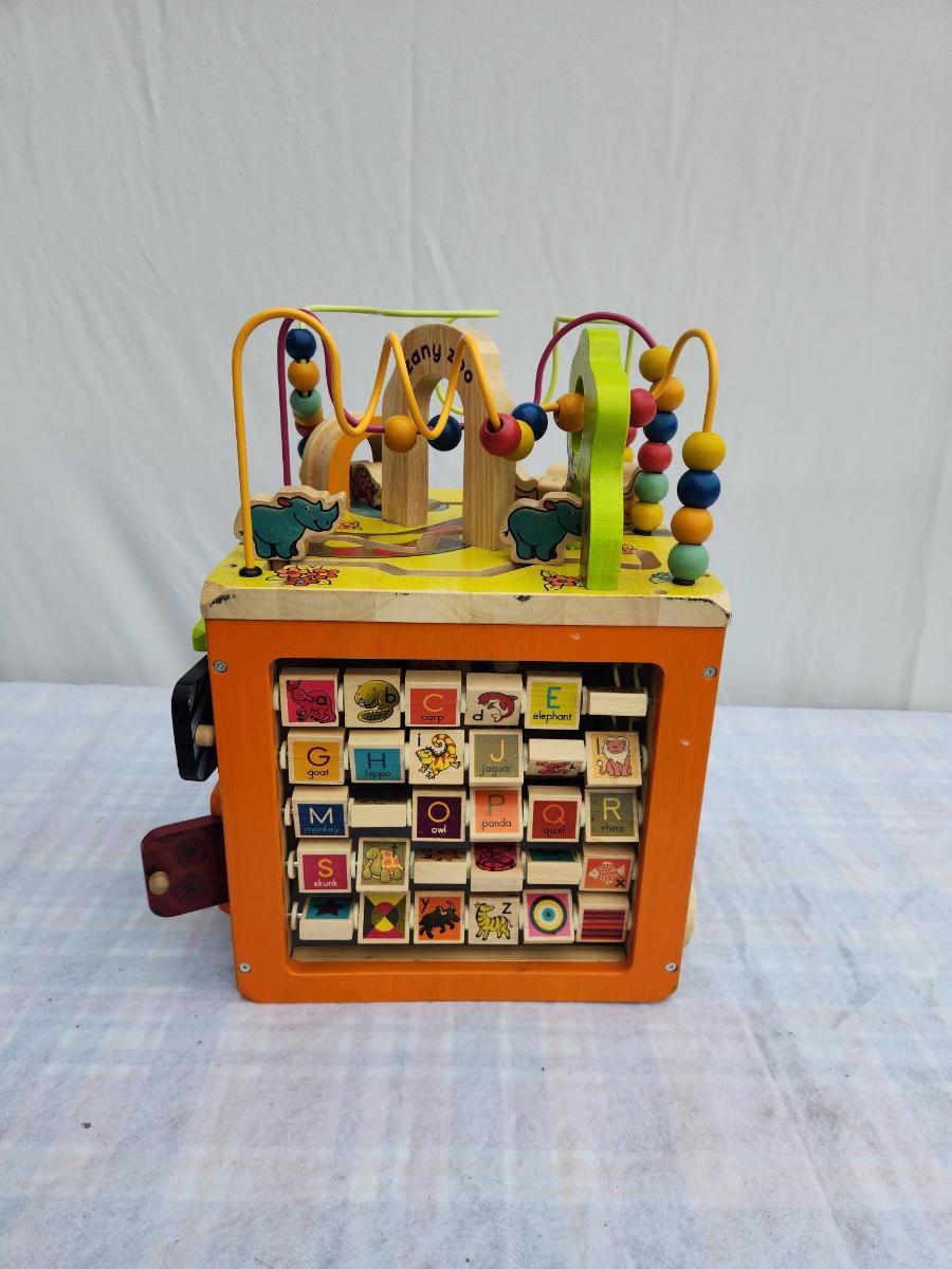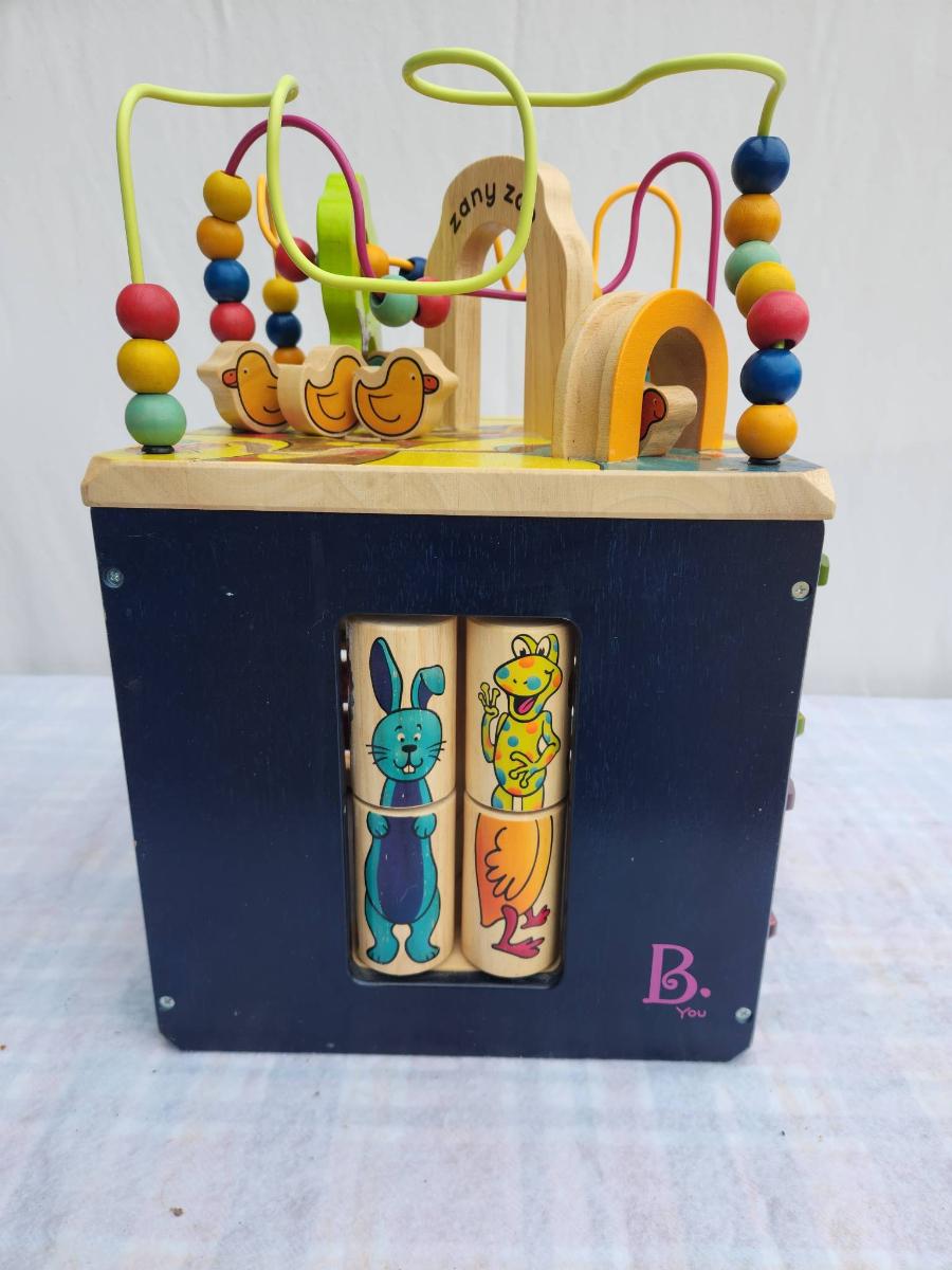 B. Toys Zany Zoo wooden activity cube designed for engaging play. Features bead mazes, spinning alphabet tiles, sliding animal doors, and rotating animal blocks. Made of wood with a multicolor design. Dimensions are not specified. Suitable for toddlers and young children. In good condition with visible use wear.