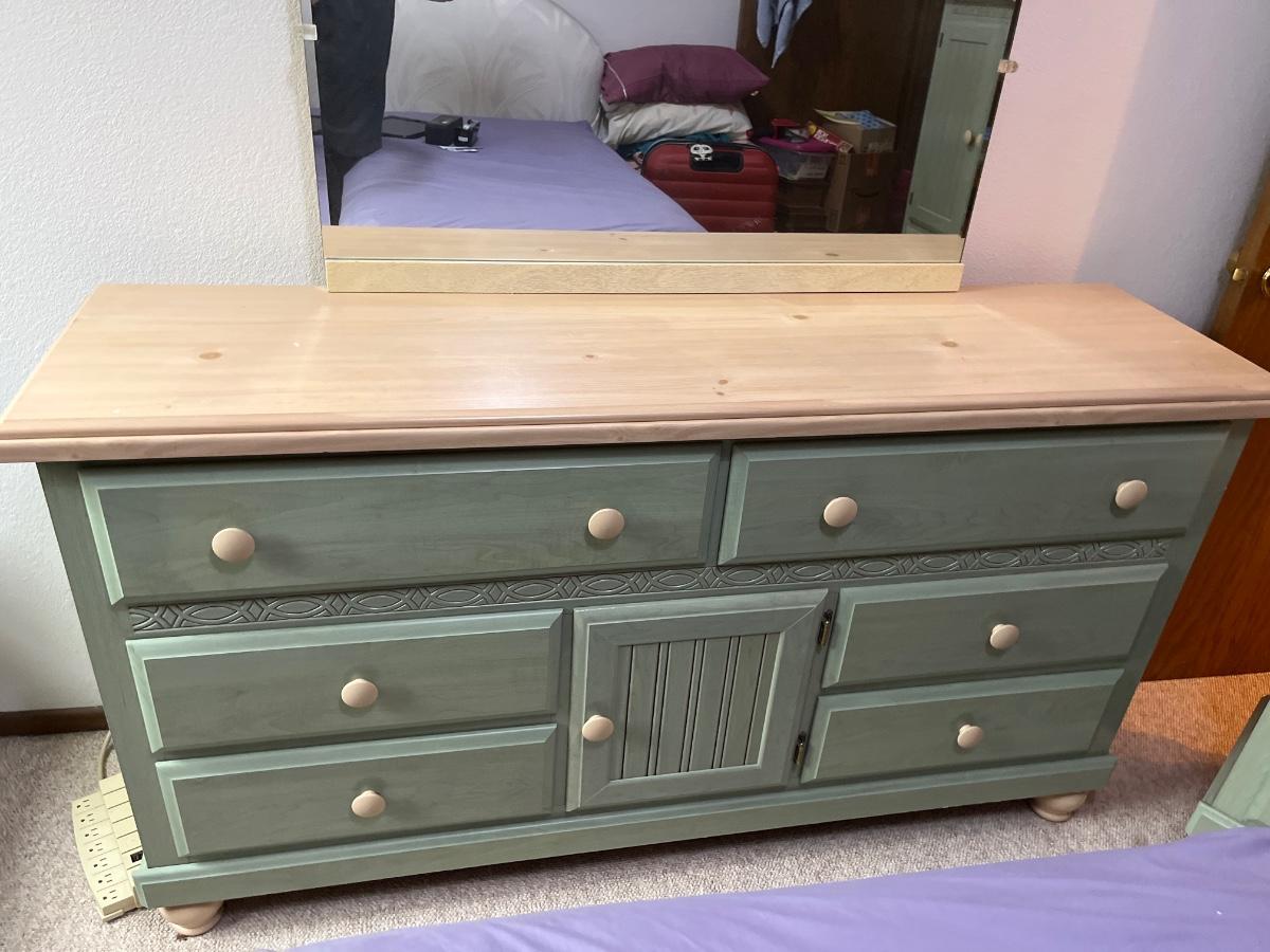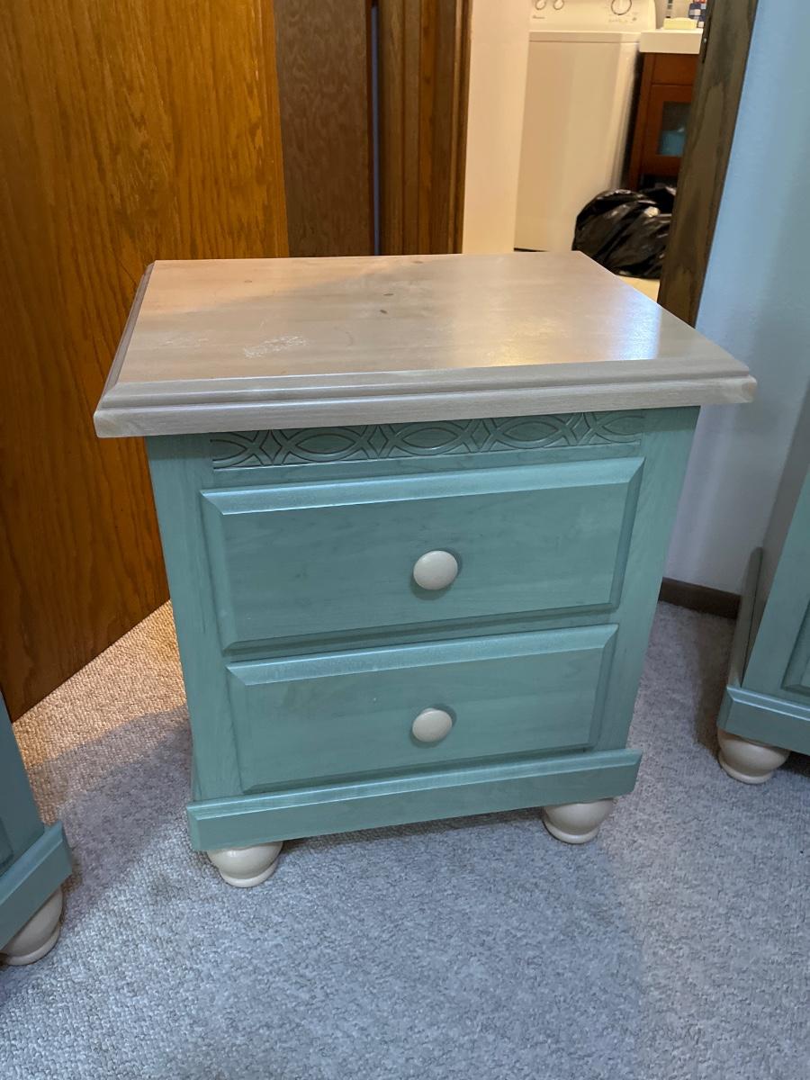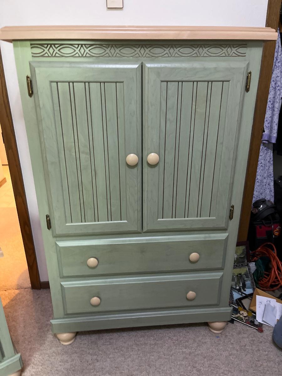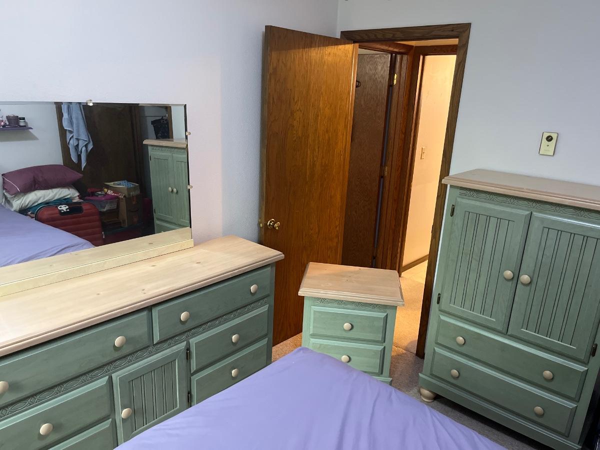 In nice condition! Dresser 63”w x 16”d x 34”h. Nightstand 23”w x 16”d x 27”h. Armoire 34”w x 16”d x 53”