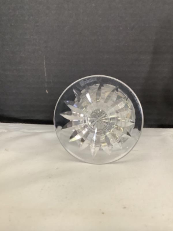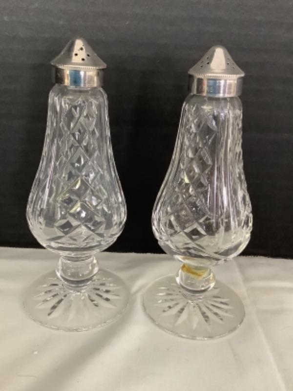 Waterford Crystal footed salt and pepper shakers with silver plate tops, one has been repaired on the castor (see photos)