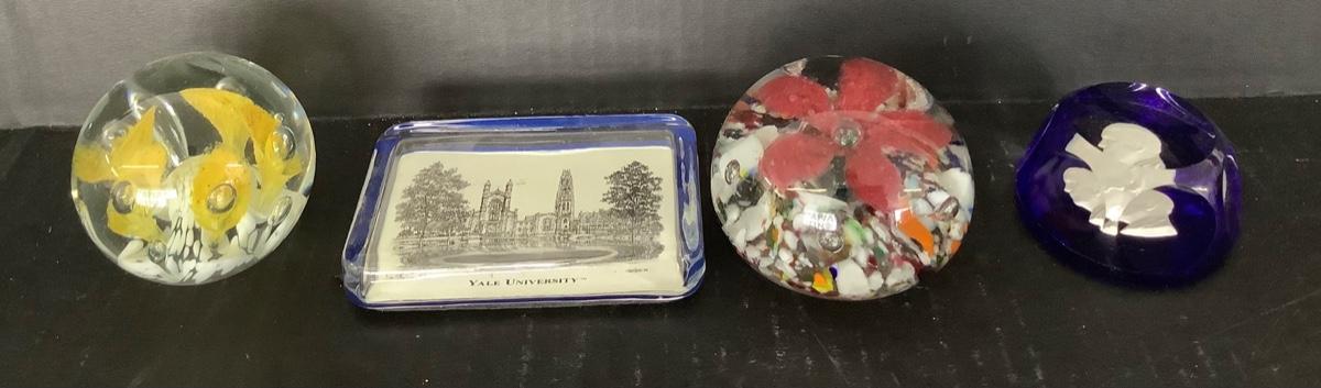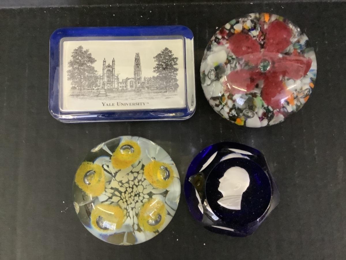 Lot of four glass paperweights, ! Rectangle shaped Yale University, 1 hexagon shaped silhouette and 2 round.