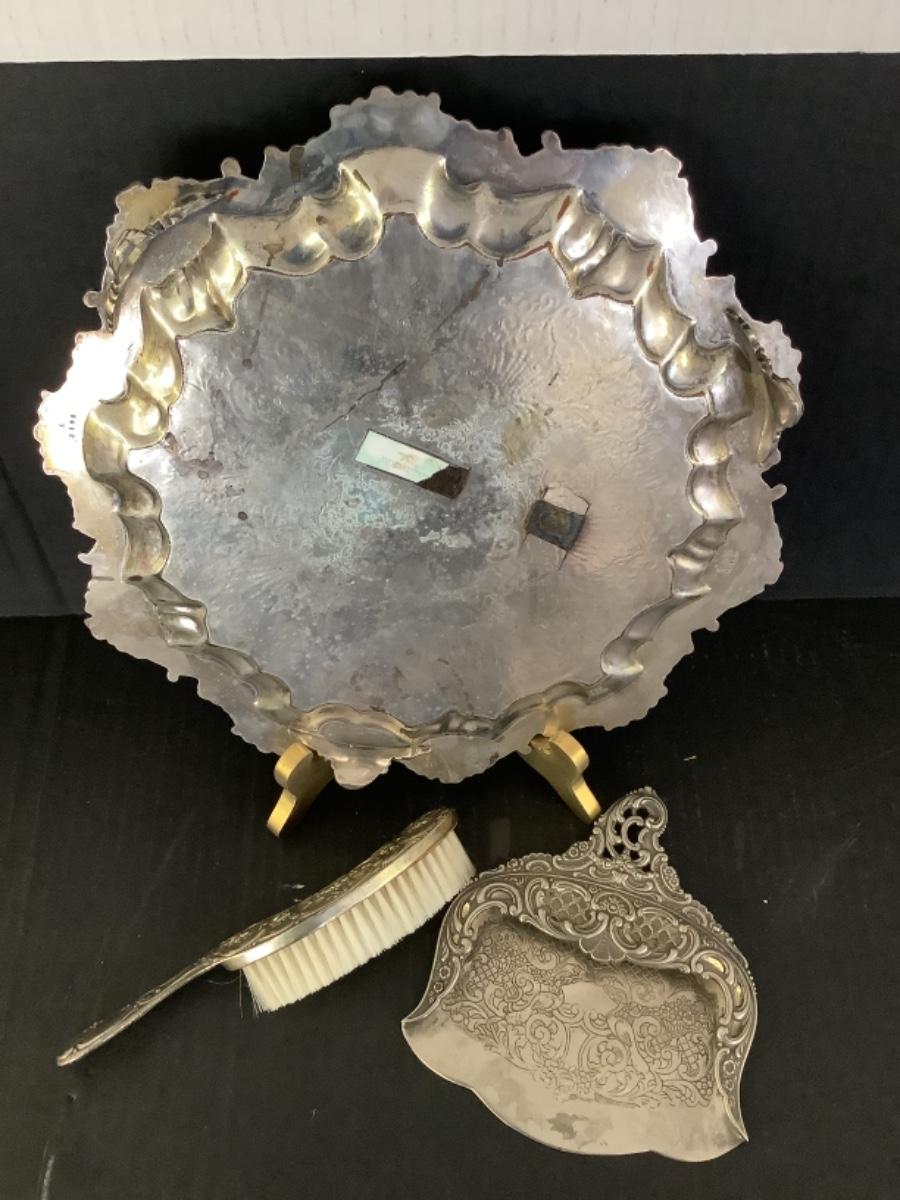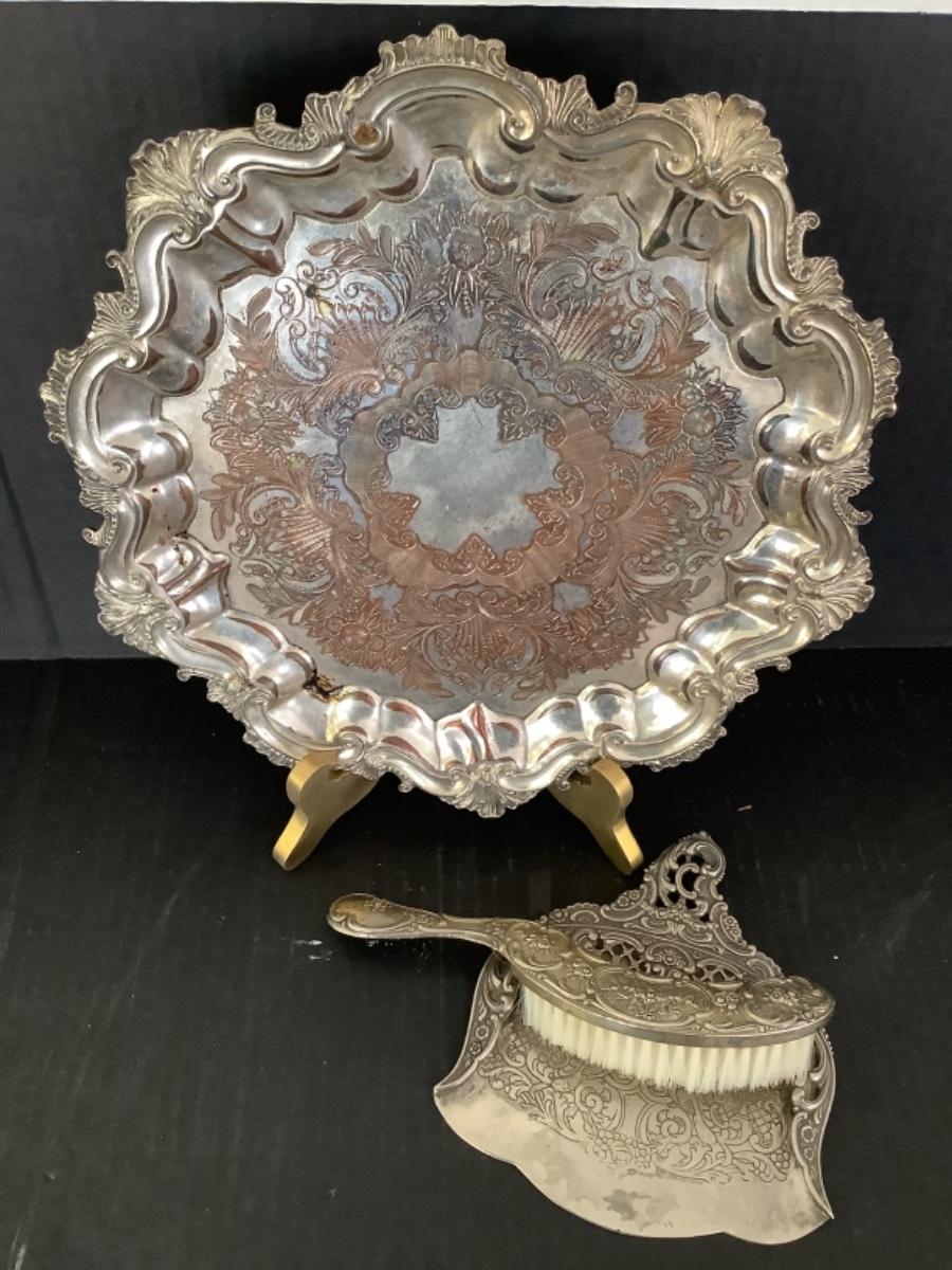 Small footed silver over copper tray and an Antique silver plate crumb catcher