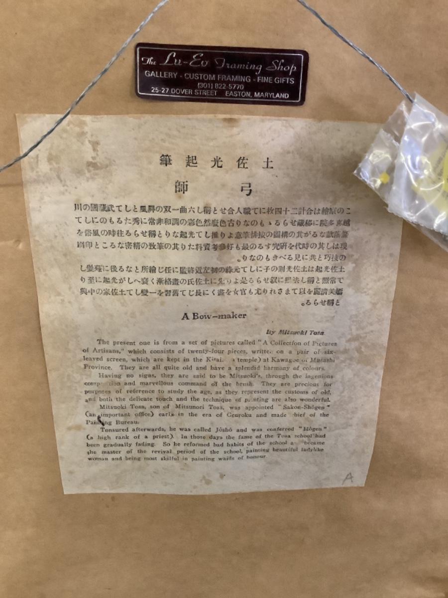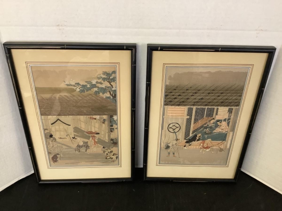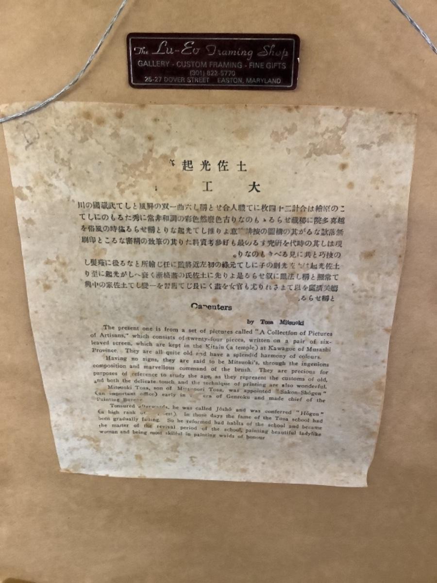 Pair of Japanese framed wood block prints “The Bow Maker” and “The Carpenters”