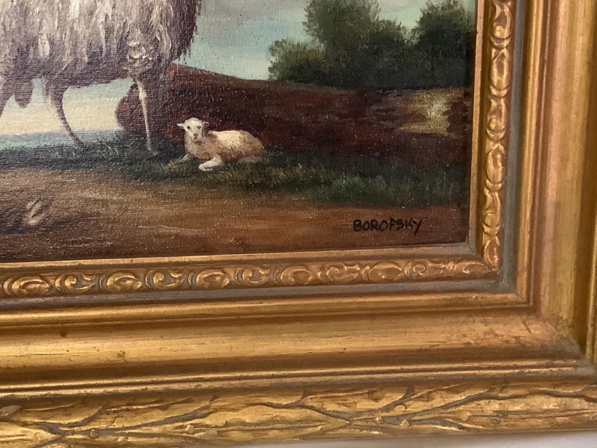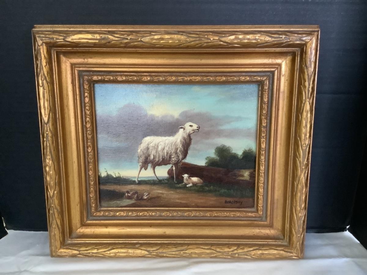 Framed oil painting on canvas of Mother Lamb and Ewe signed Borofsky, measures 14-1/2” x 16”