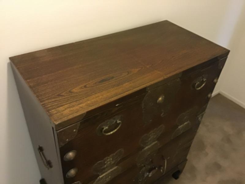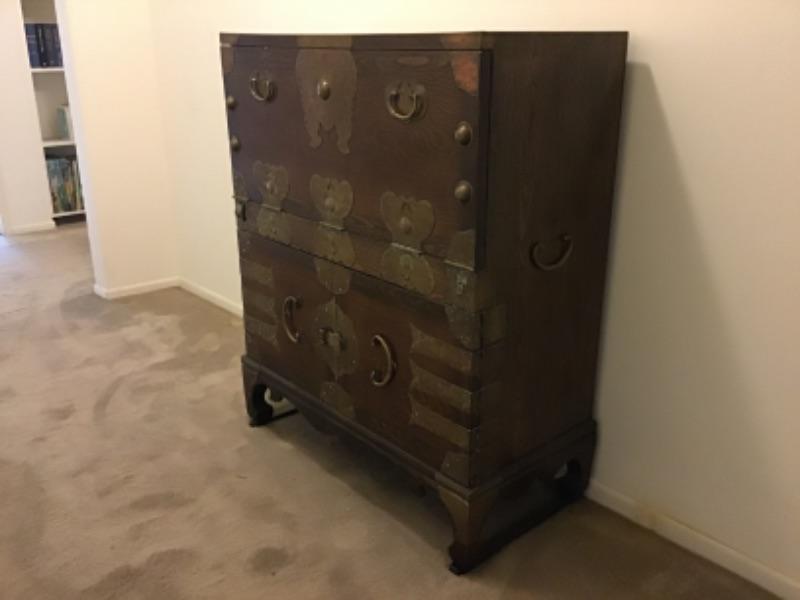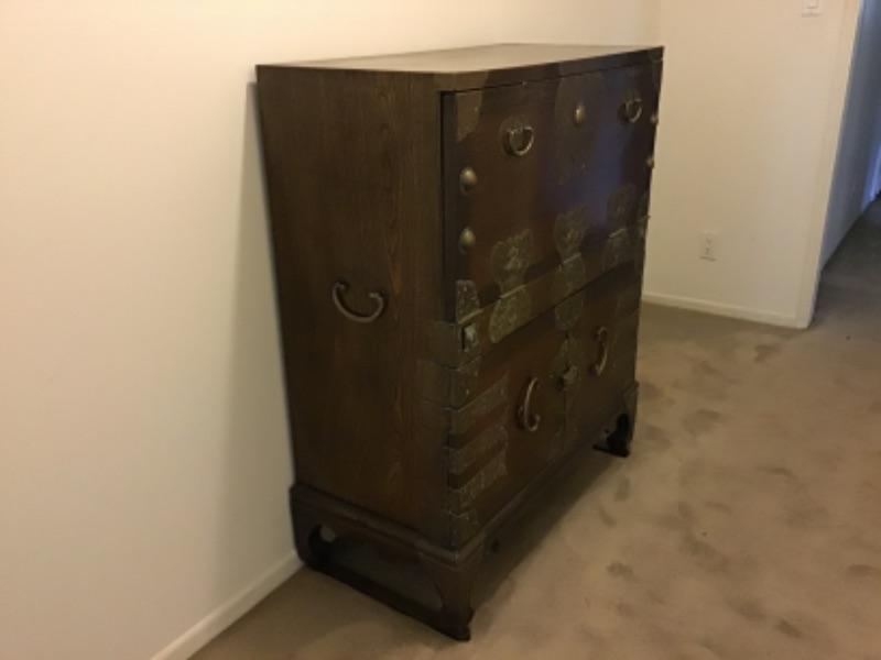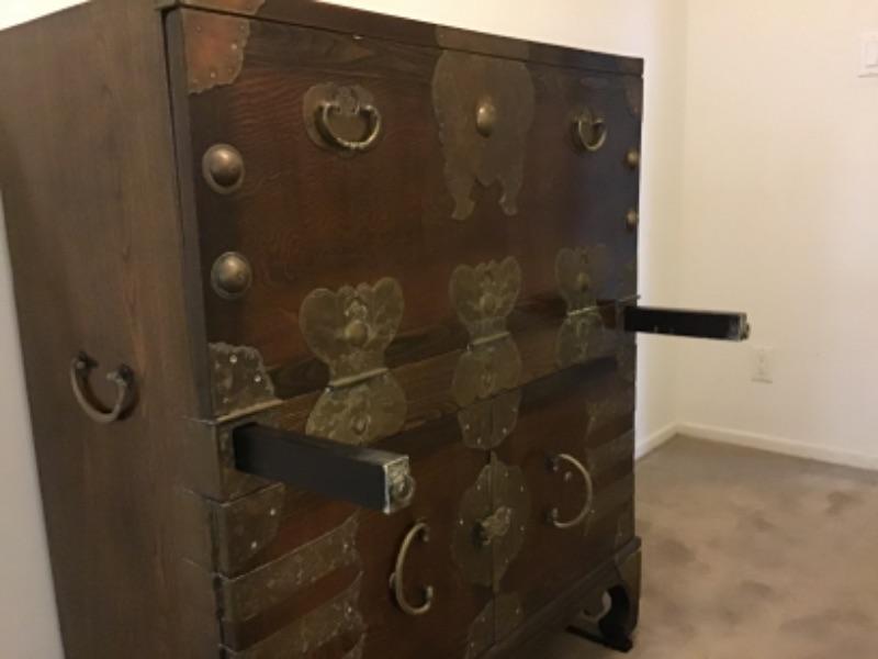It’s 35 3/4” wide x 17 1/4” deep x 44 1/4” tall. Woods, decorated with brass.