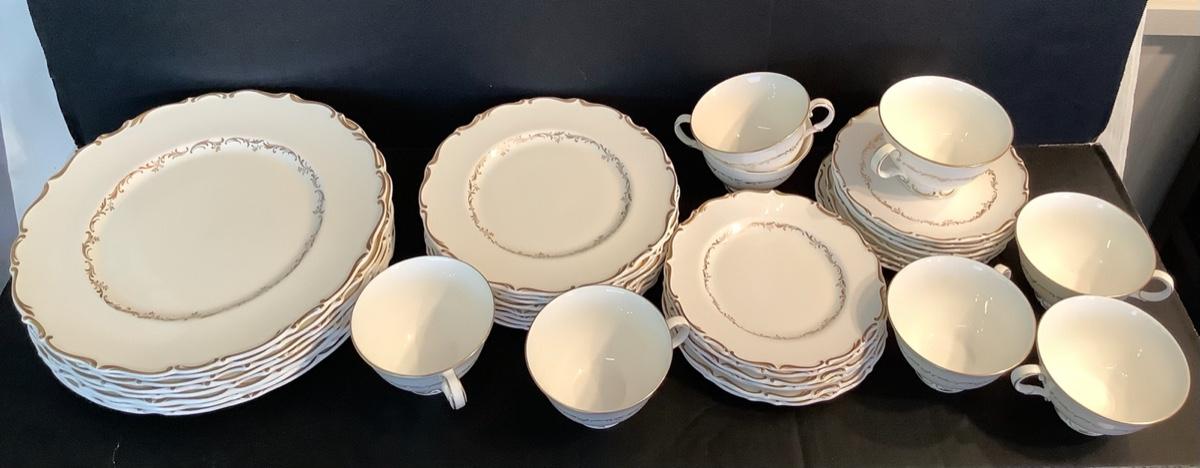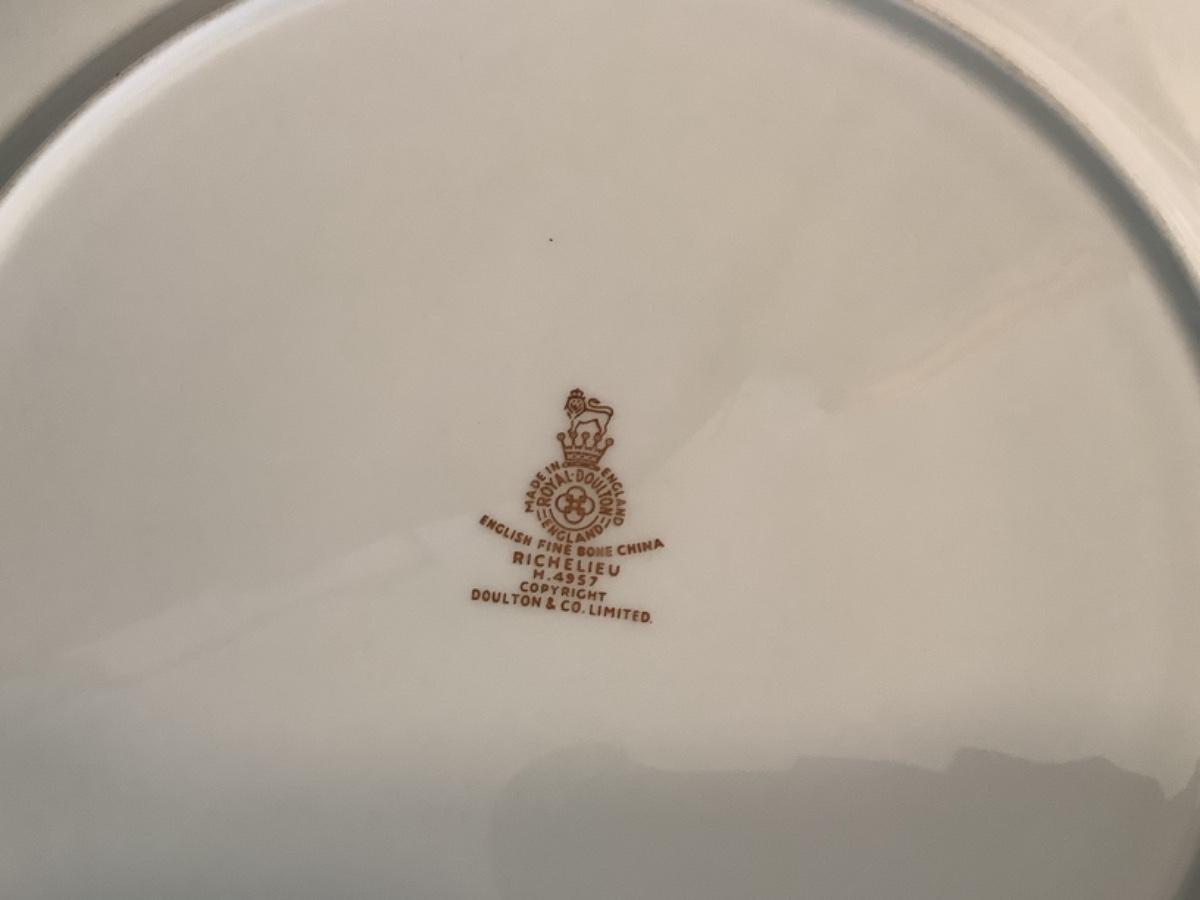 39 piece set of Royal Doulton Richelieu Pattern English Fine Bone China- 8- 10” Dinner Plates, 8- 8” Salad/Dessert Plates, 7- 6-3/4” Bread Plates, 8- Tea Cups and 8- Saucers. Whole set is in great condition