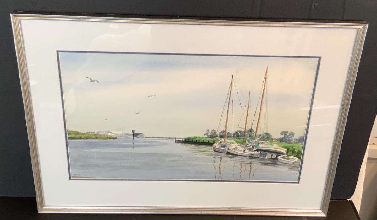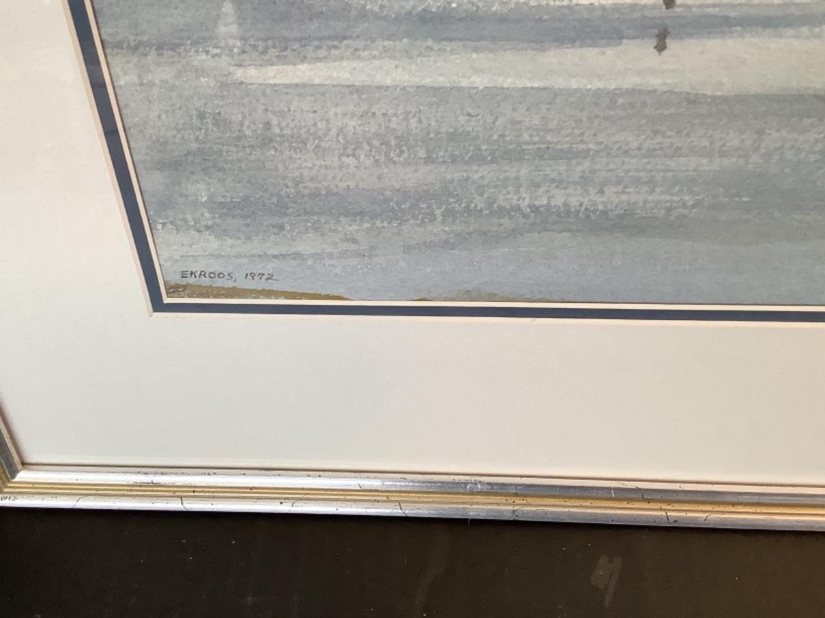 Framed Waterfront Scene watercolor signed Ekroos measures 27” wide and 19” high