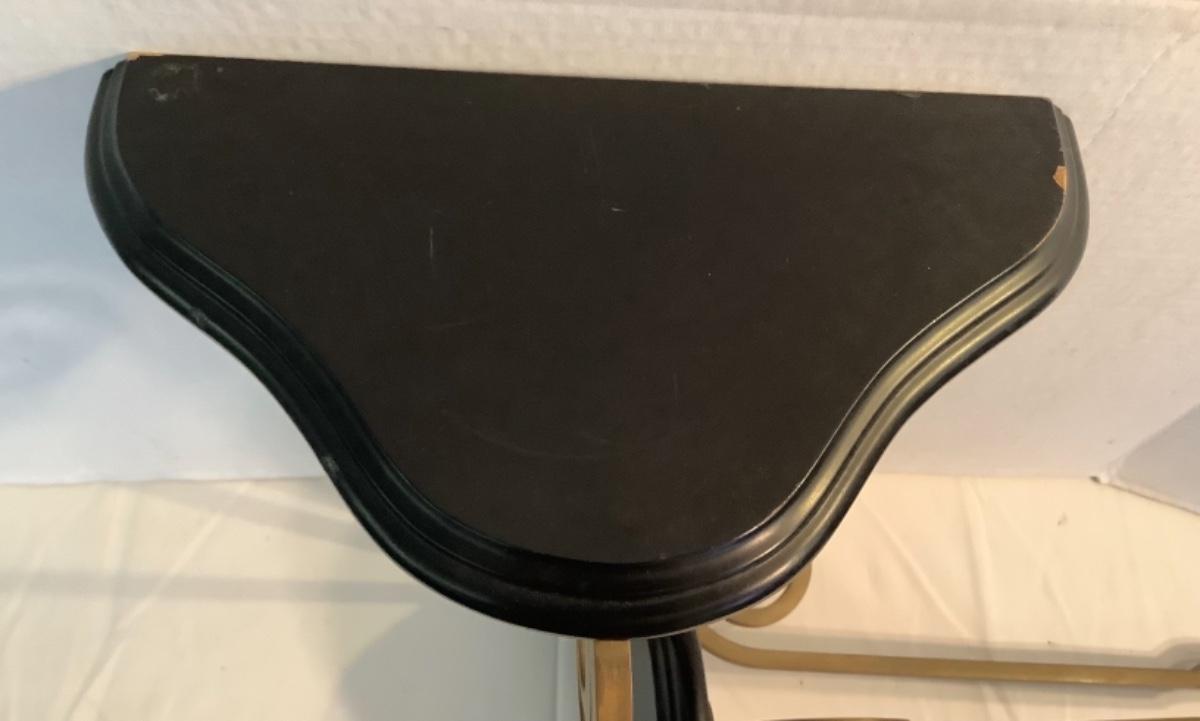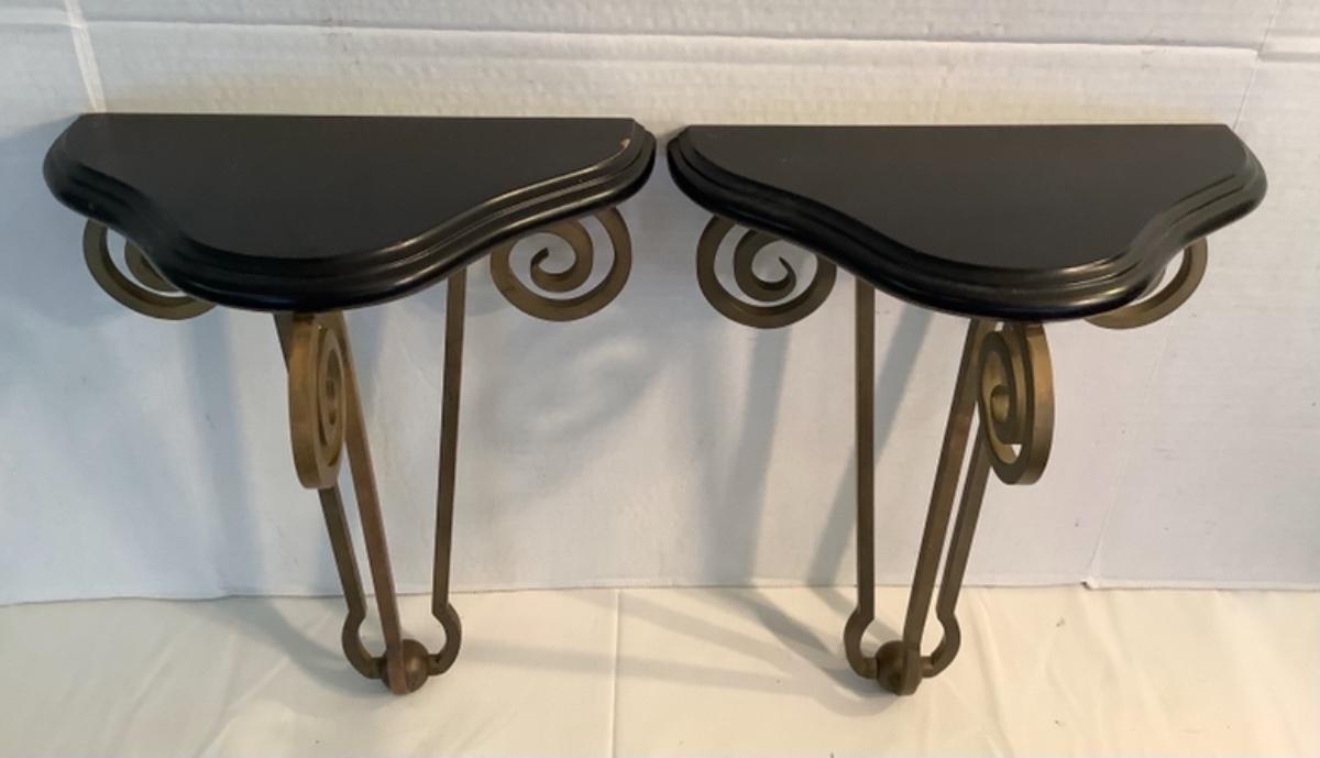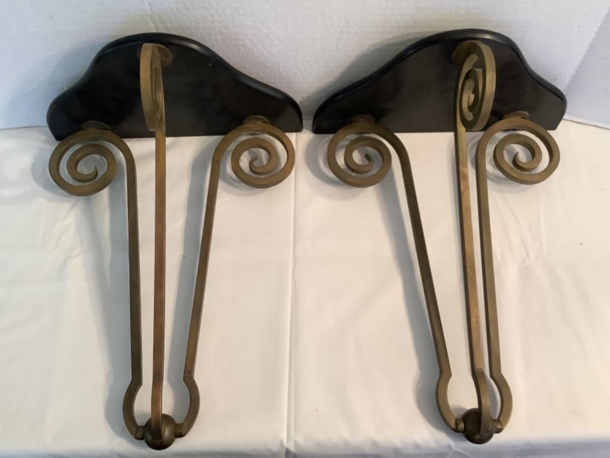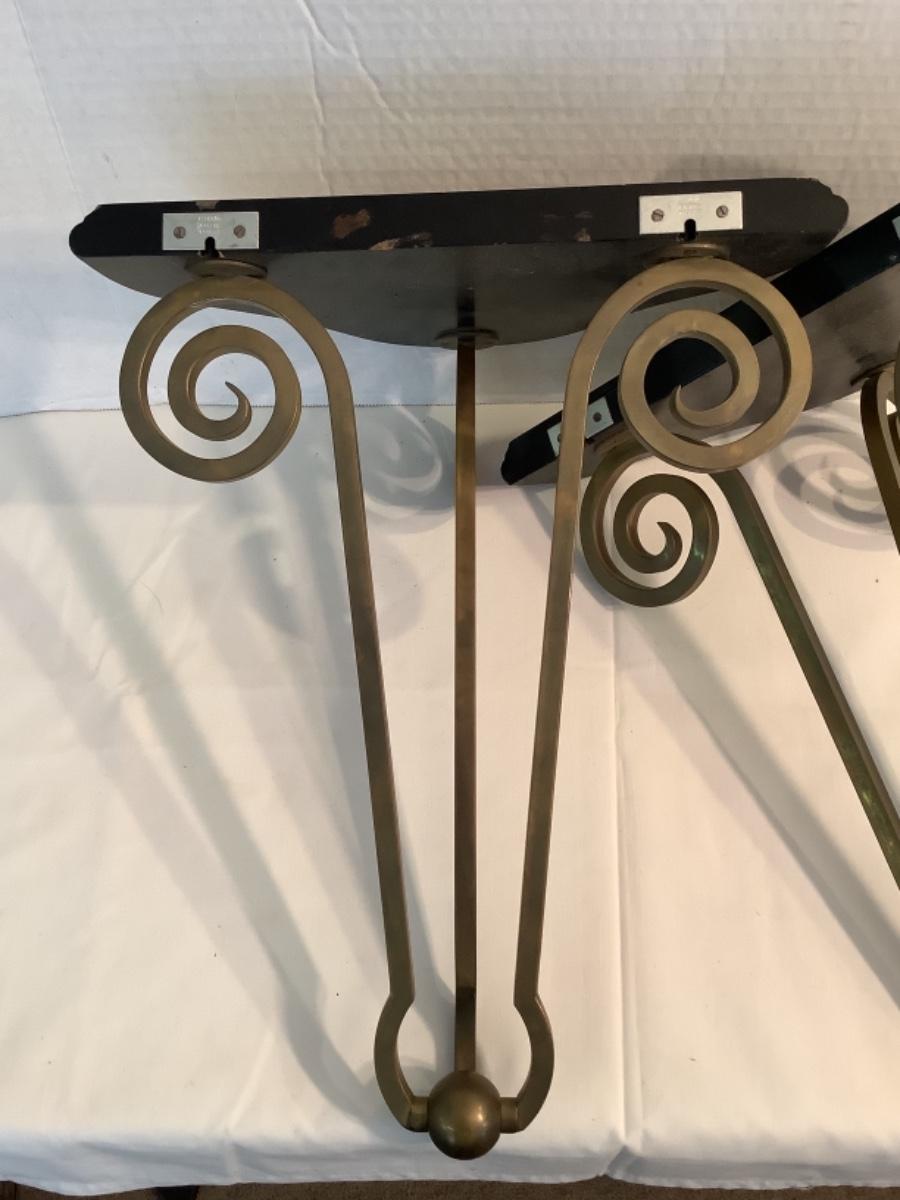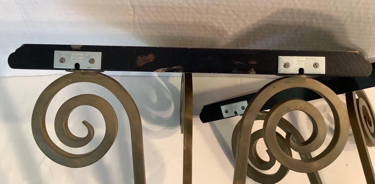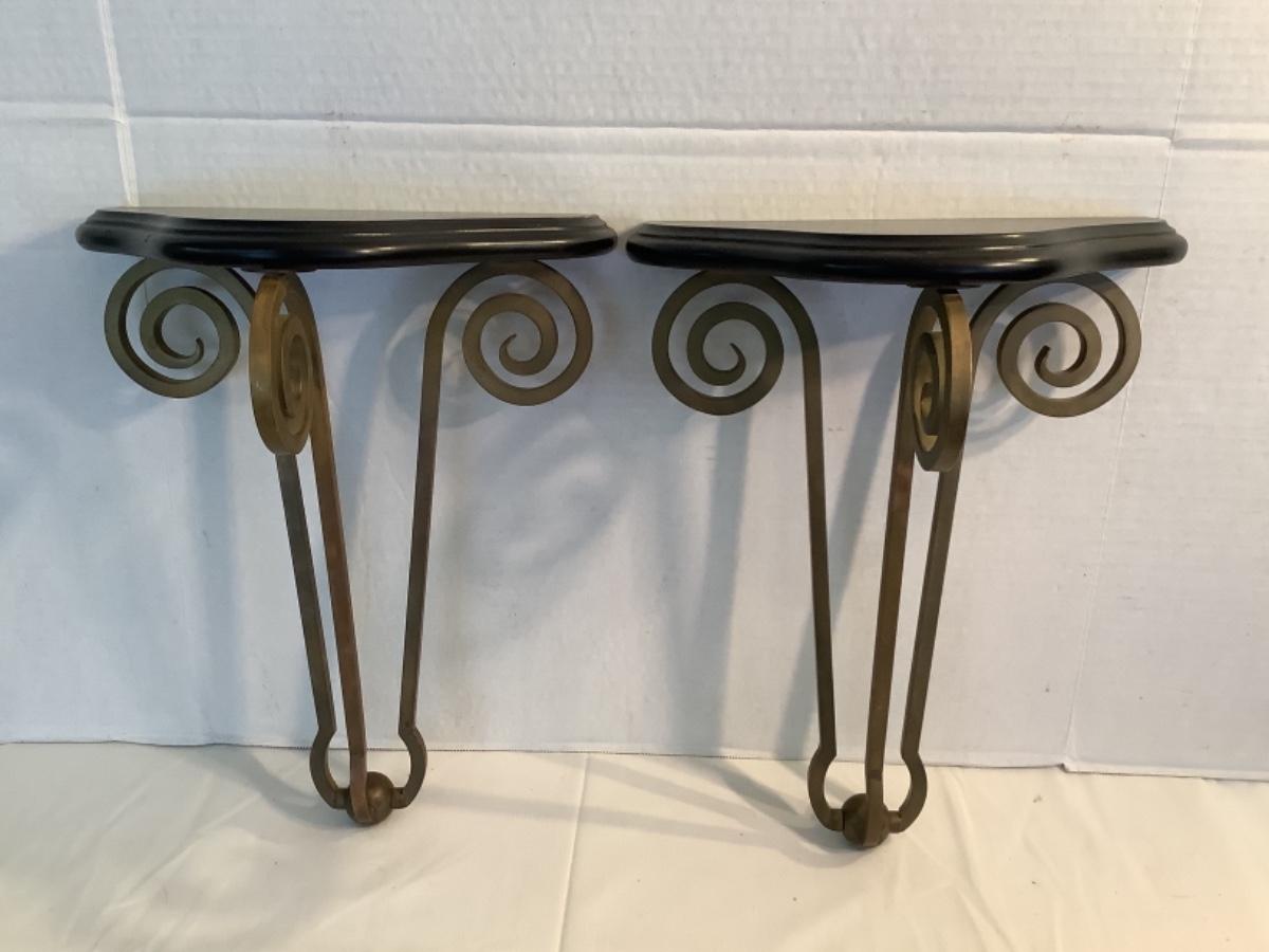 Pair of brass and black hanging wall shelves, have a few chips in the paint (see photos), measuring 16” tall and 12-1/2” wide at widest point
