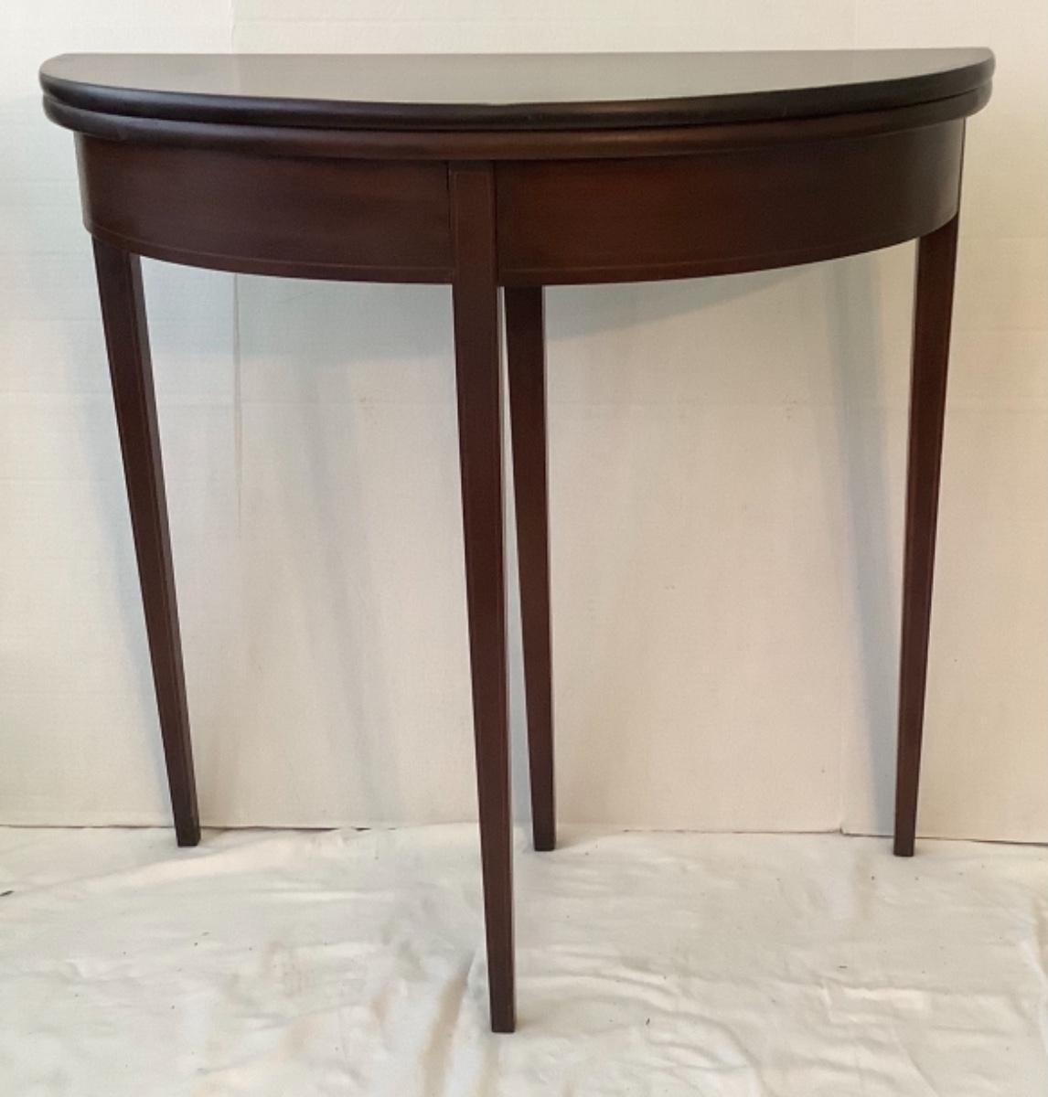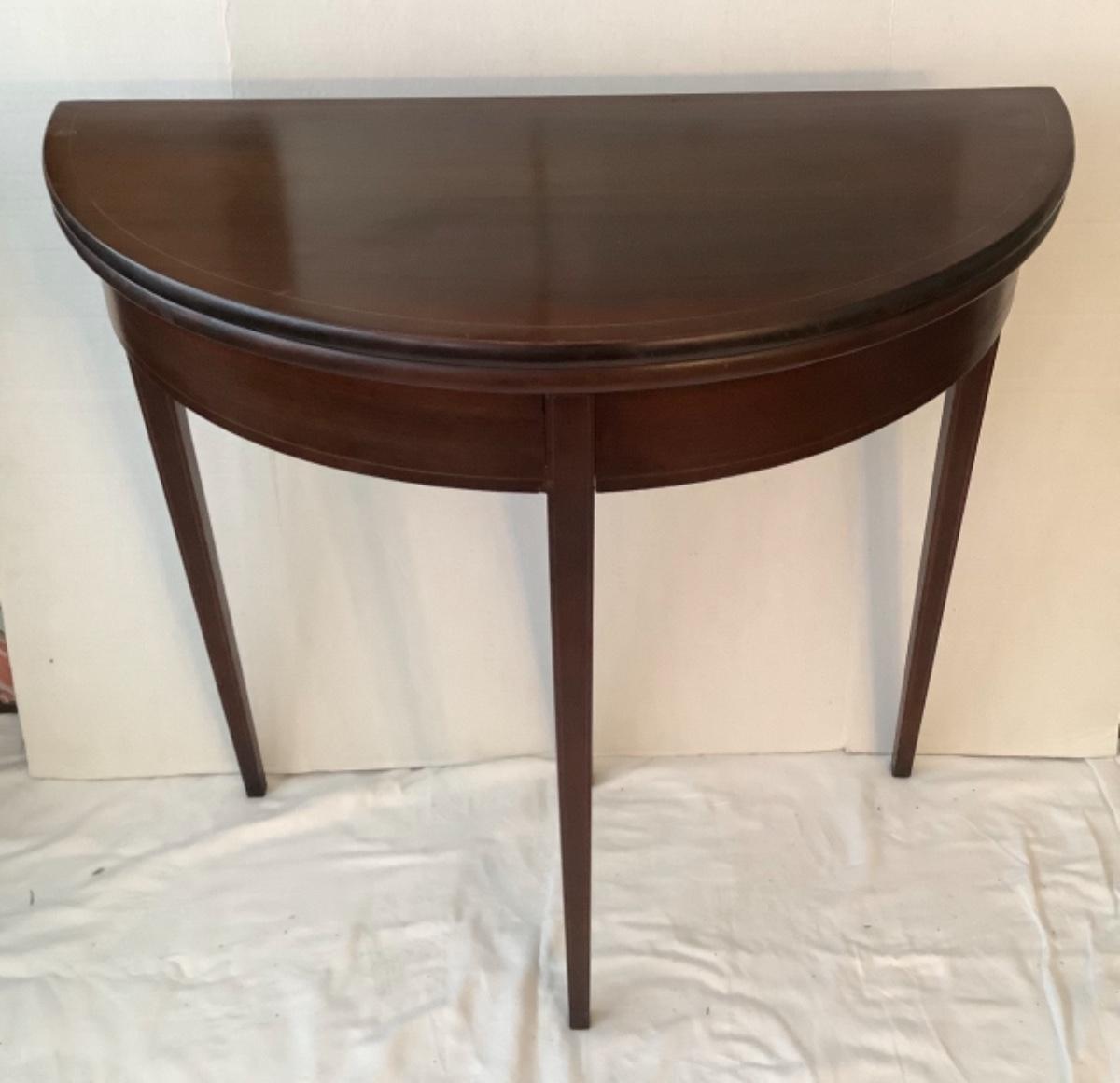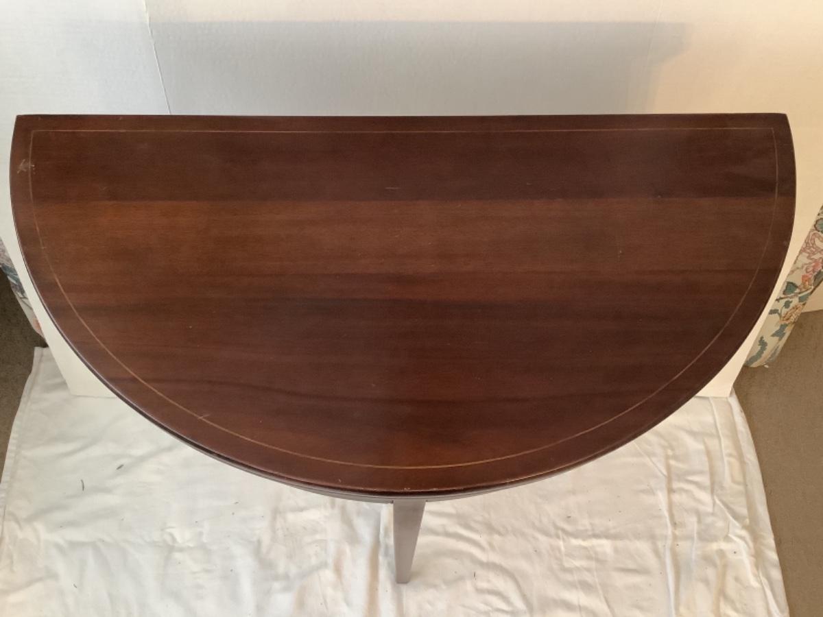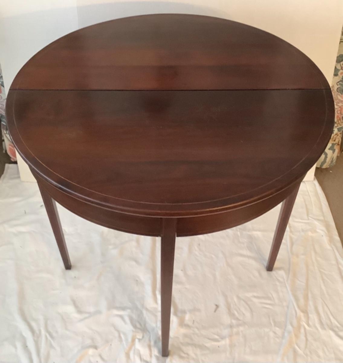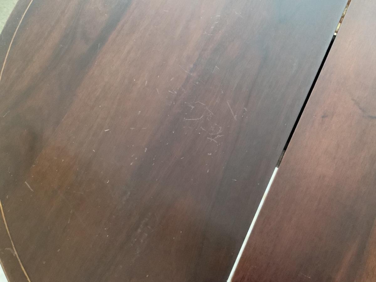 Mahogany flip top tea table has some scratches on table top (see photos) , measures 29-3/4” high and 32” diameter when opened up