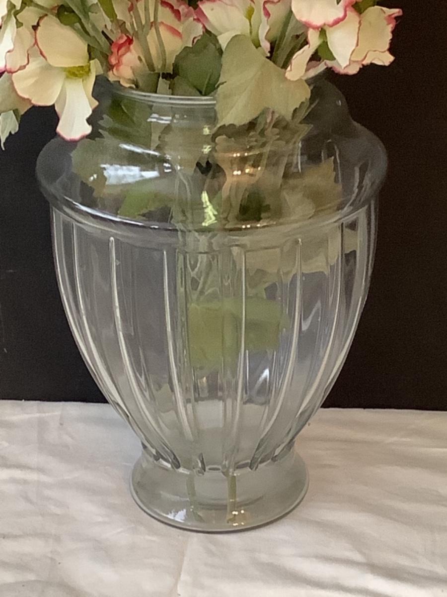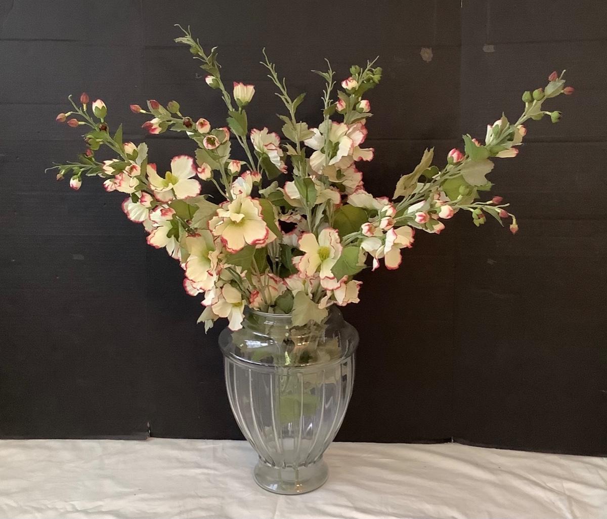 LArge crystal vase measures 14” tall with a 6” round base, comes with faux silk Hollyhocks
