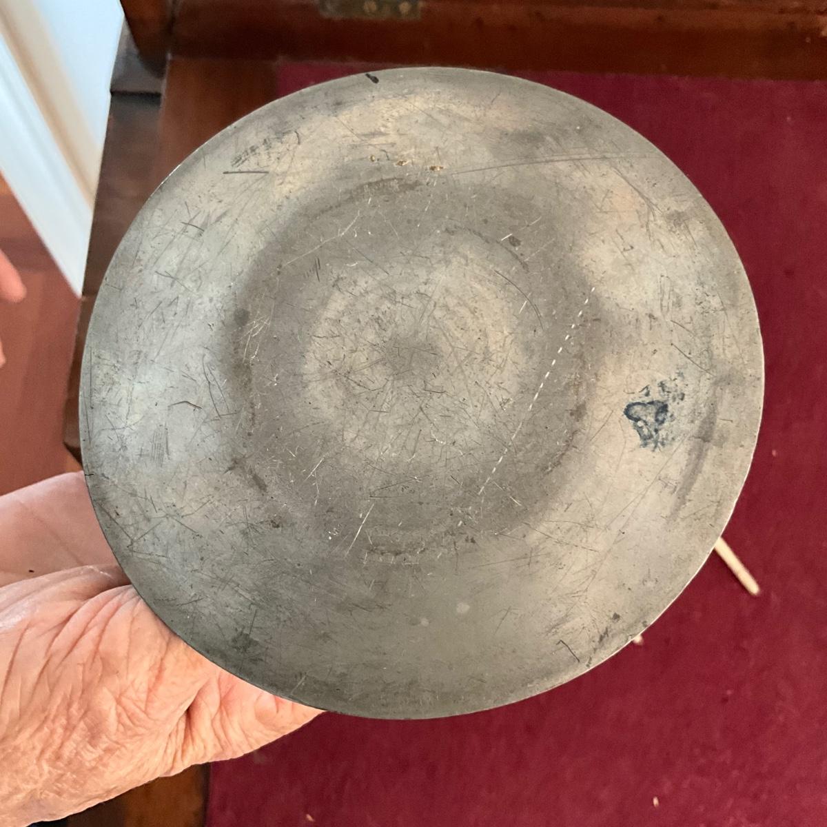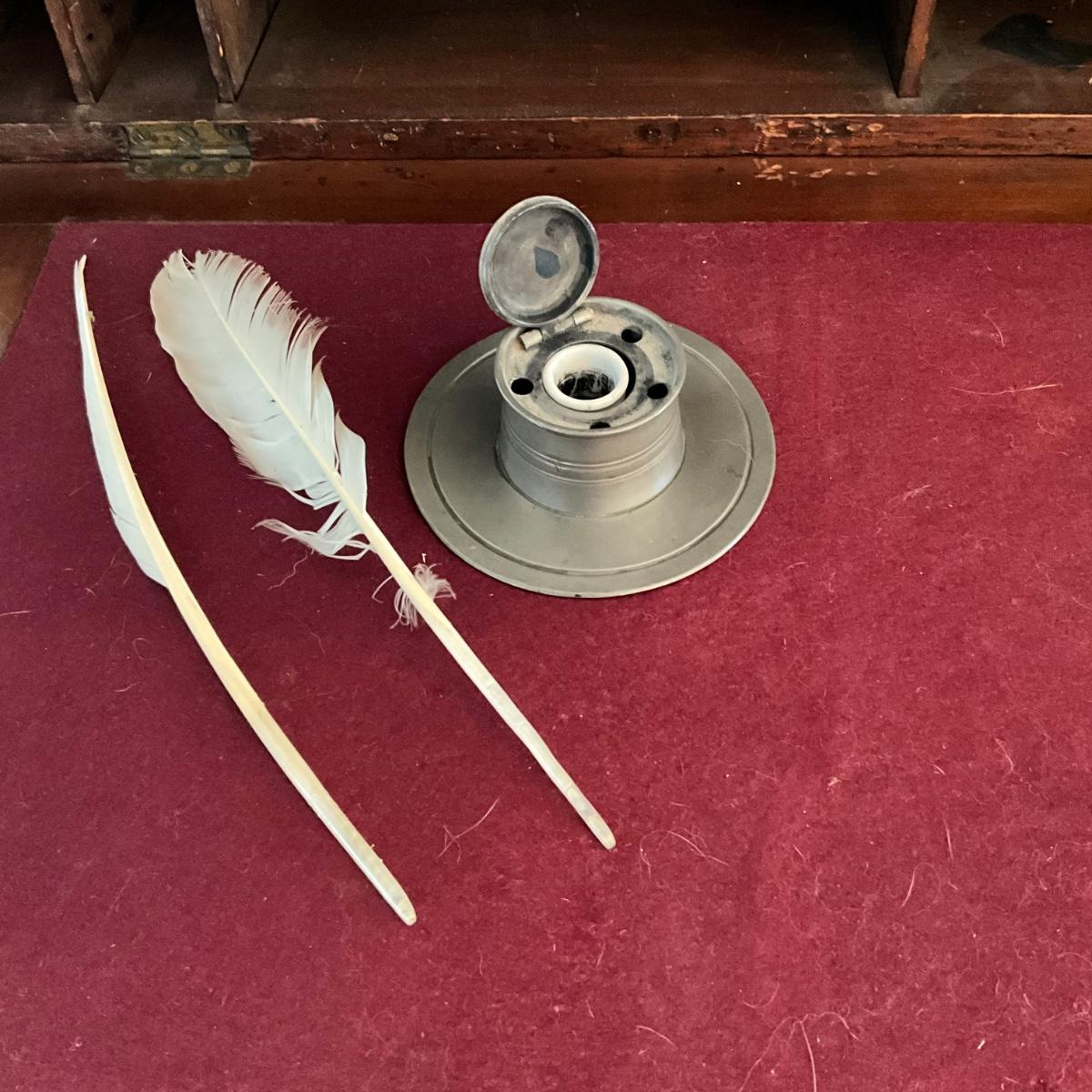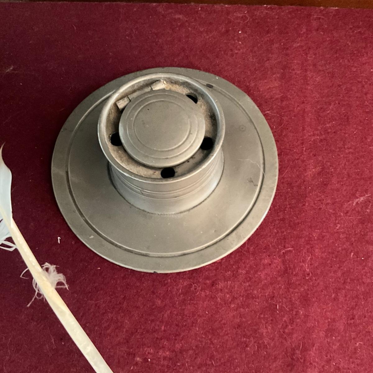 B1157 Antique Pewter Inkwell with Porcelain Well and Quills