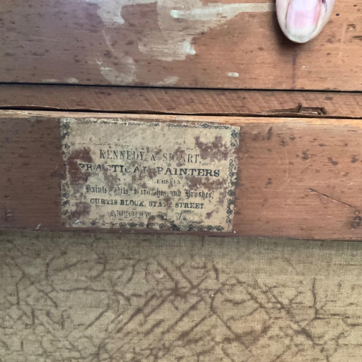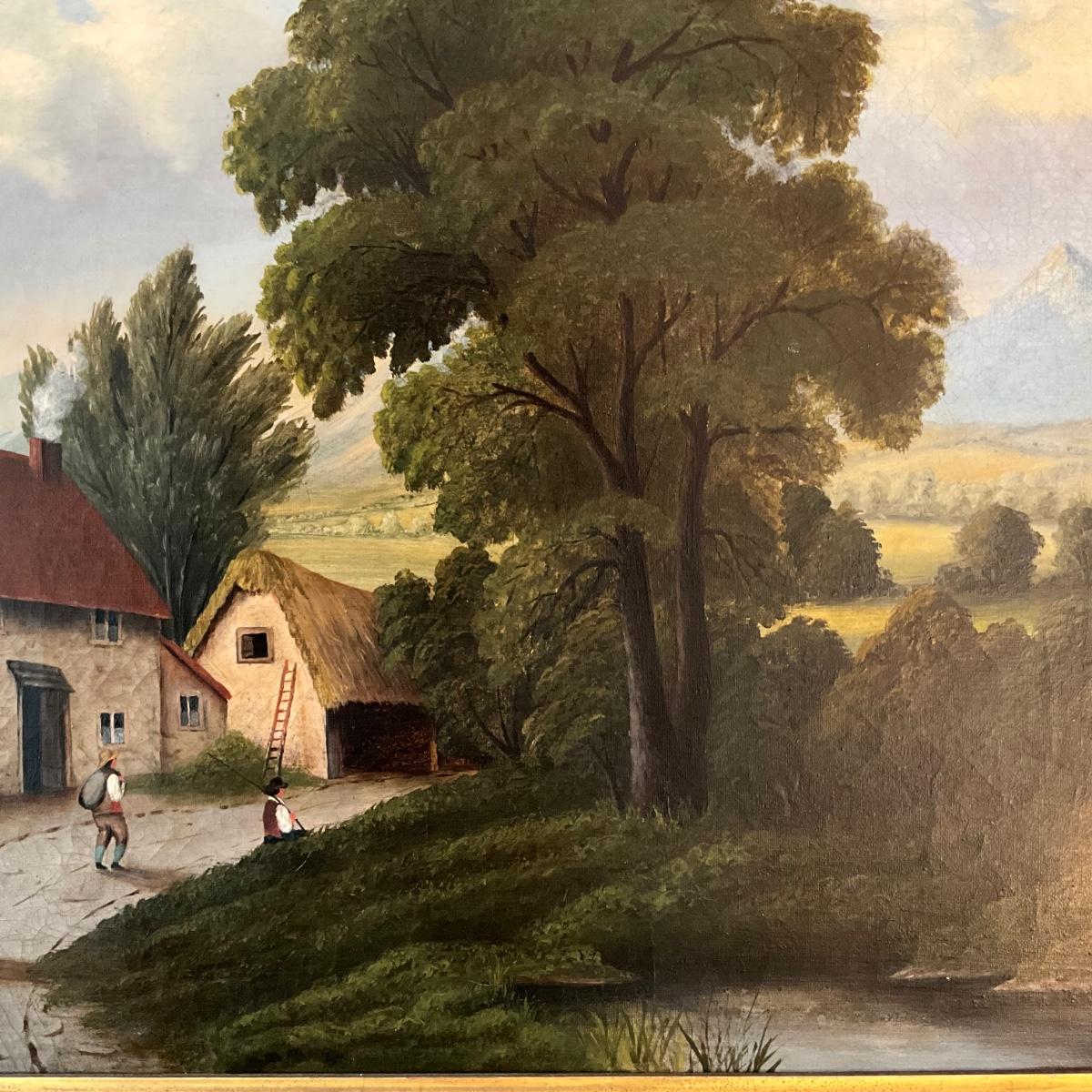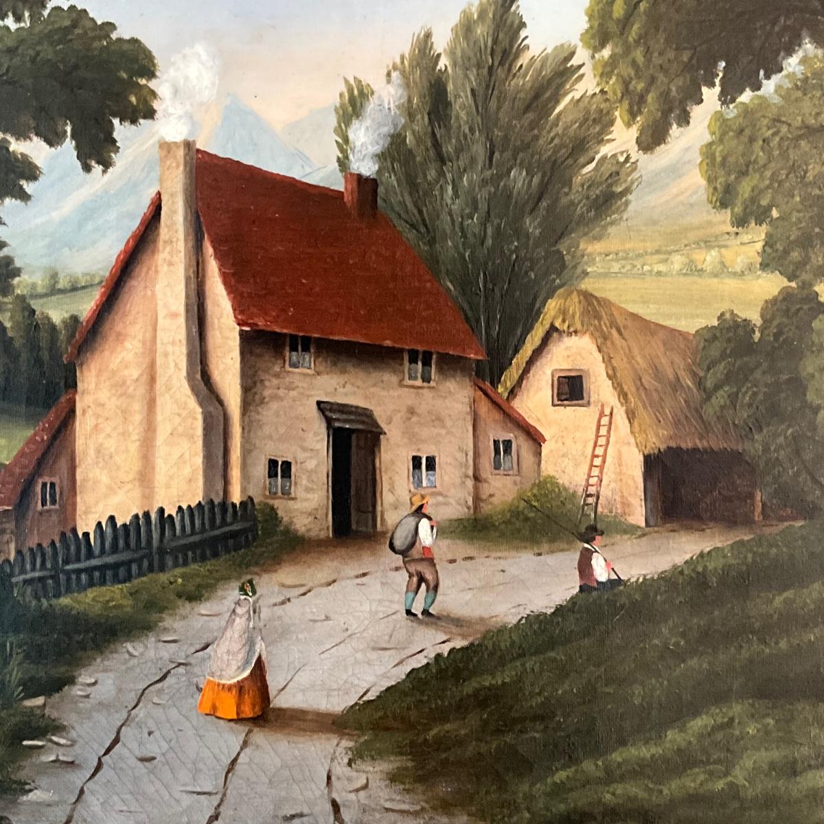 B1159 Antique Oil on Canvas Figural Landscape Painting of Village Scene