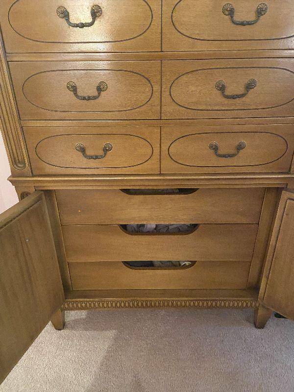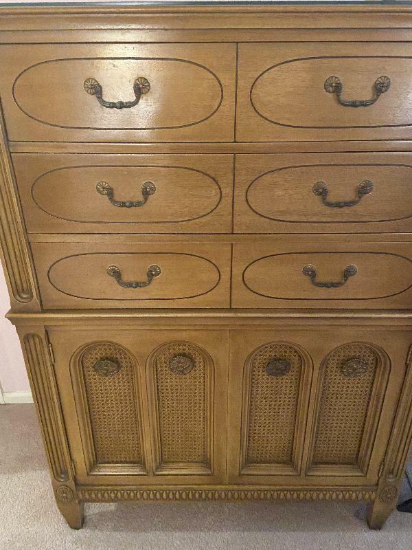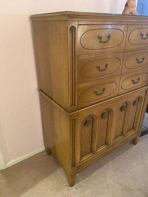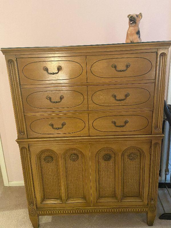 Matching the set, this tall dresser has loads of storage and is in good condition. With glass top protector.