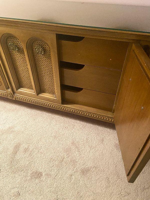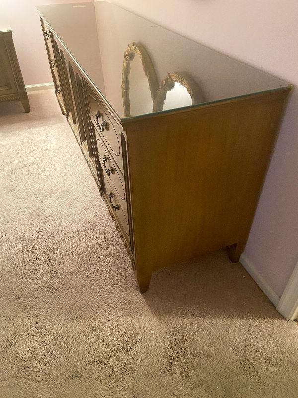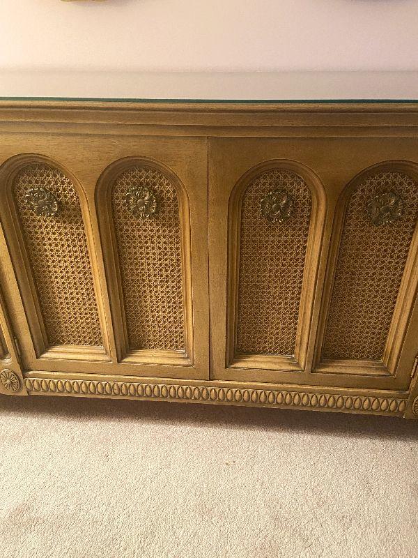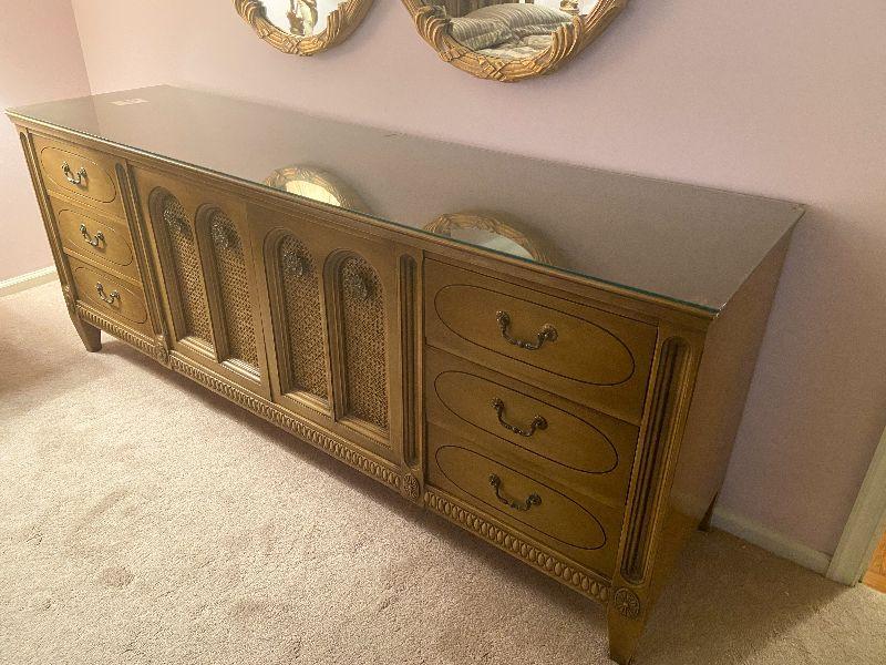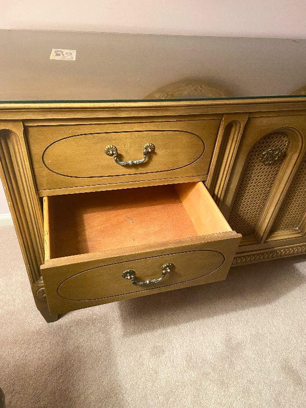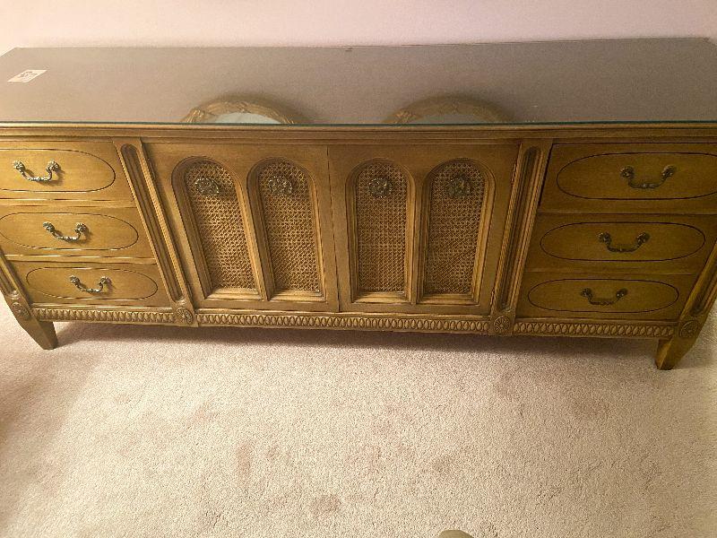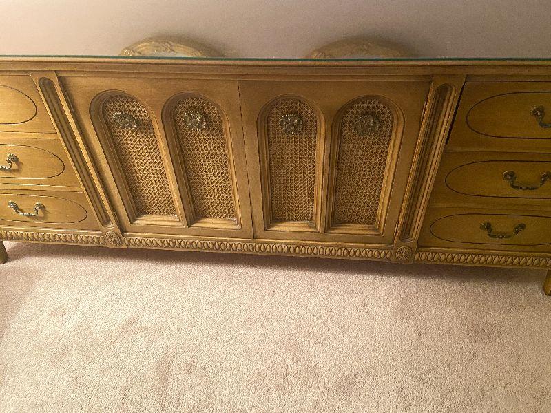 Vintage long dresser with glass top protector.