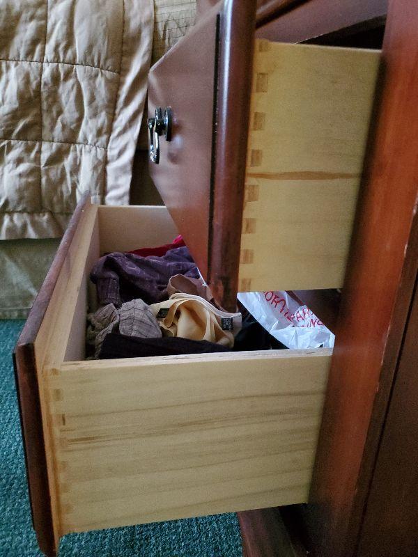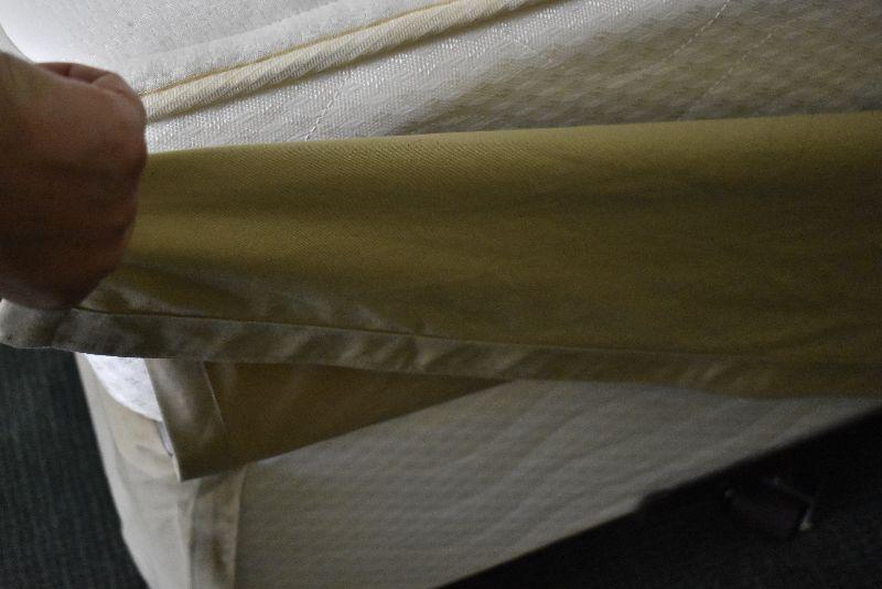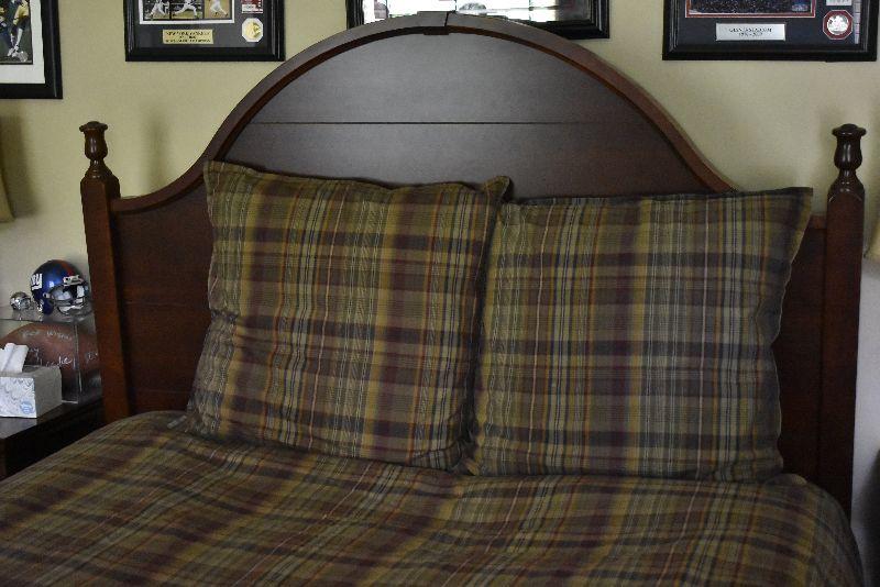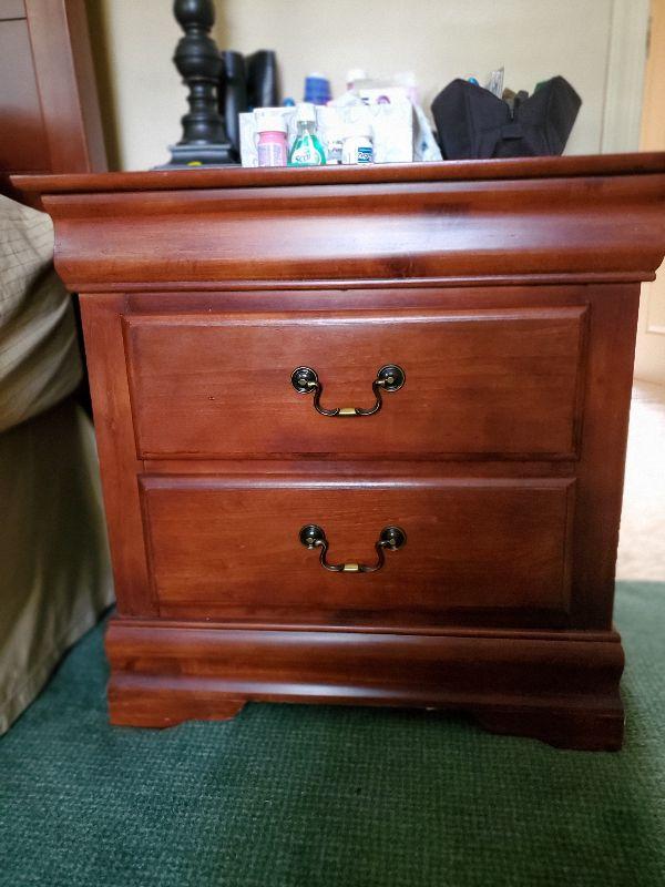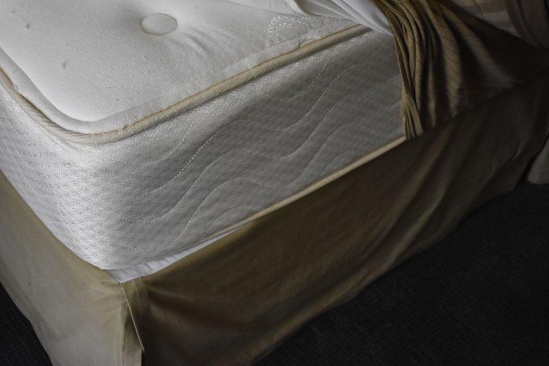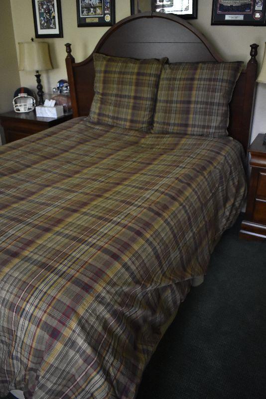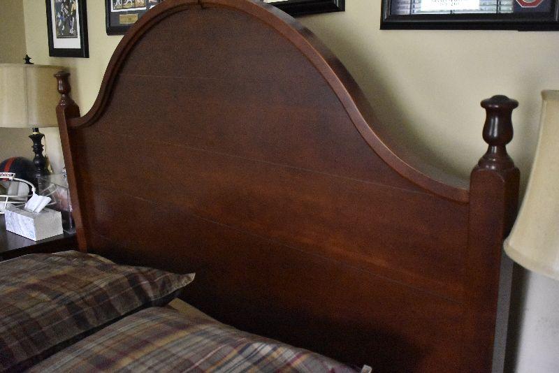 Queen size headboard with two matching nightstands (28"l x 28"w x 18"d) -Set is in excellent condition. Comes with mattress and box spring with frame.