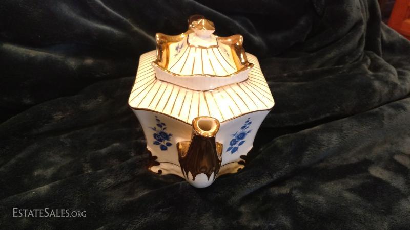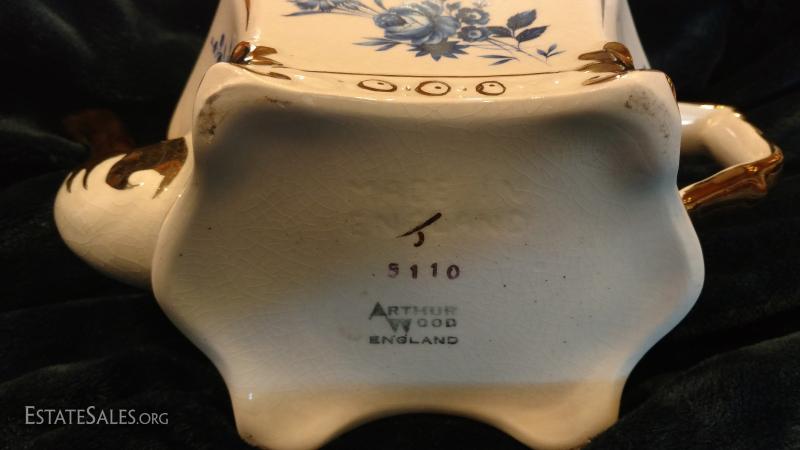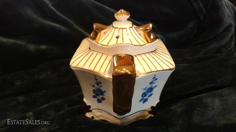 B1-3 VINTAGE ARTHUR WOOD HEXAGONAL TEAPOT Blue floral on white, TRIMMED IN GOLD!