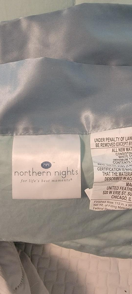 Northern Lights teal white down blanket, pillows mattress pad. Queen size.