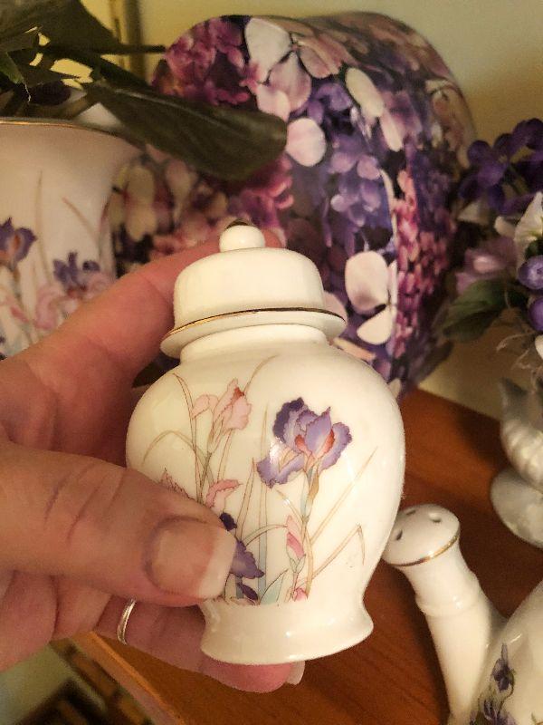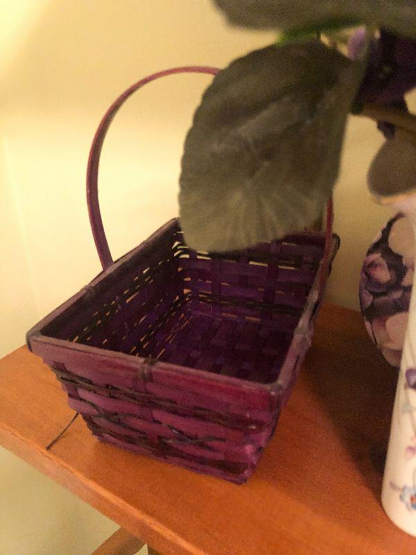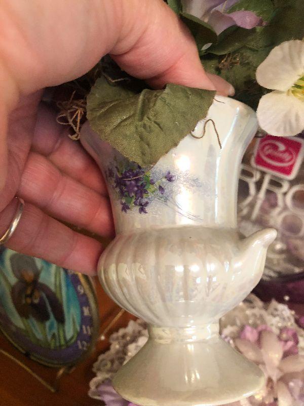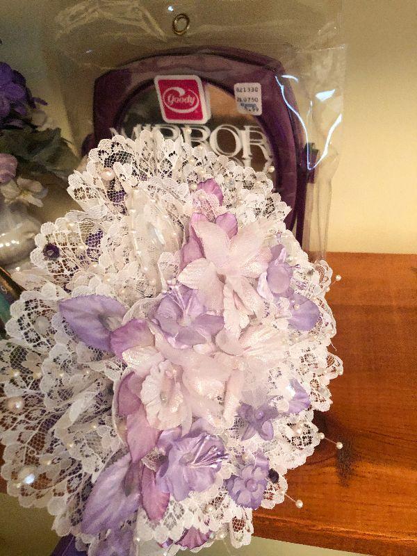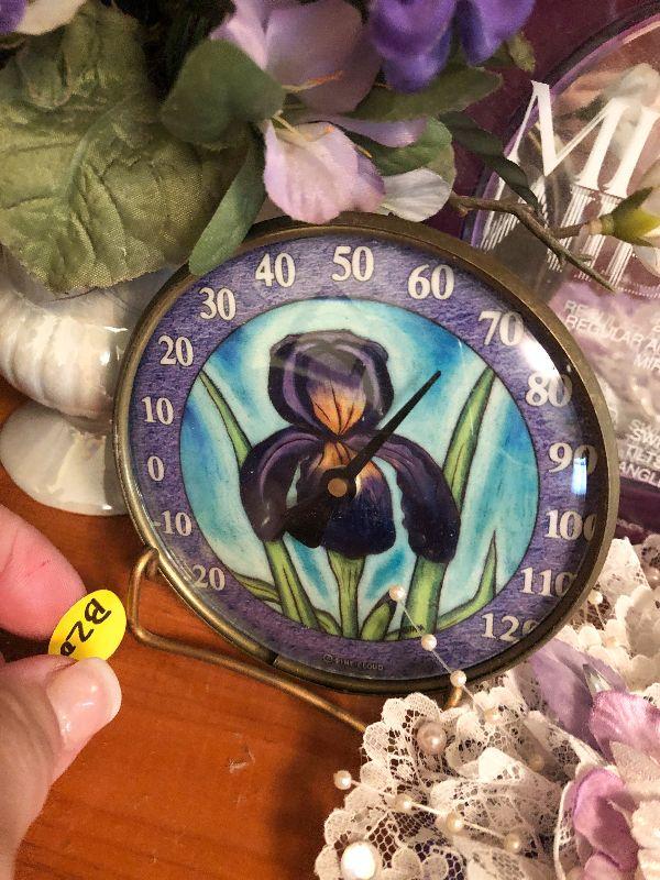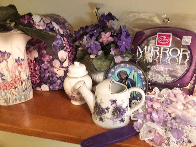B15: Purple Floral Decor Lot, Mirror, Thermometer, Vases, Flowers