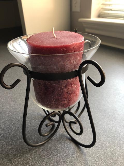Black metal stand with clear glass vessel. Brand new Candle included. Stands 6 1/2” tall and 7” in