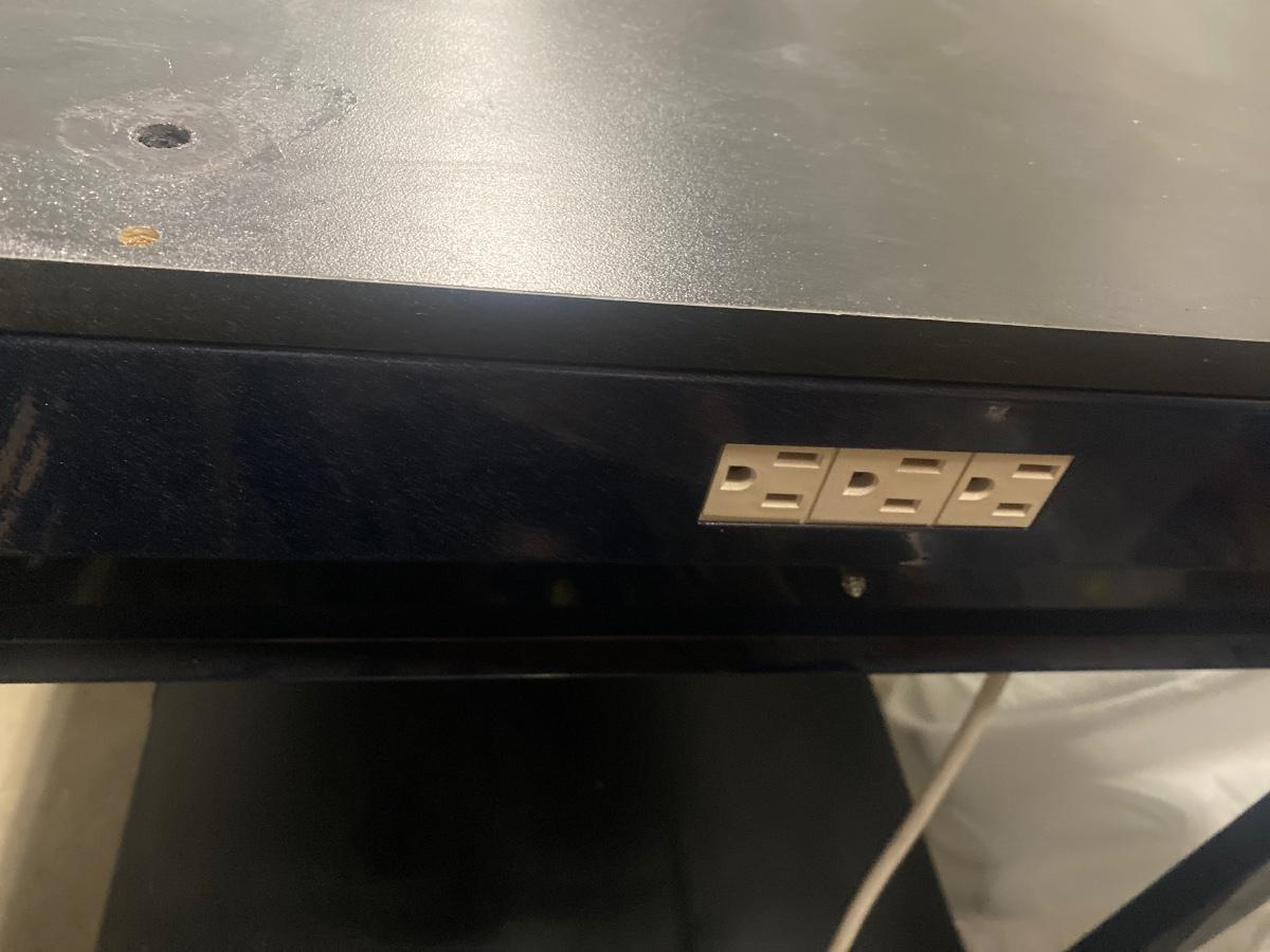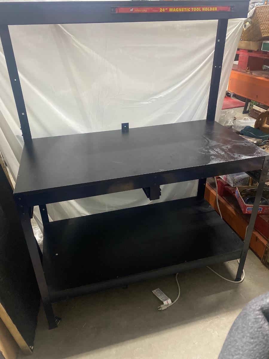 B2 light weight work bench, wood top, magnetic strip along the top, no drawers, and power cord insert along the side. 61 1/4” tall, 57 1/2” wide, 23 3/4” deep.