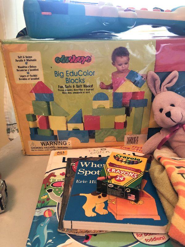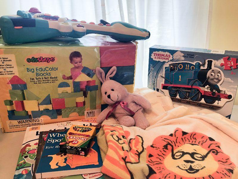 Vintage tiger towel, soft blocks, Thomas puzzle and more. Please see all pictures for exact contents of the lot, condition of the items, and measurements if taken. Thank you for looking and have fun bidding.