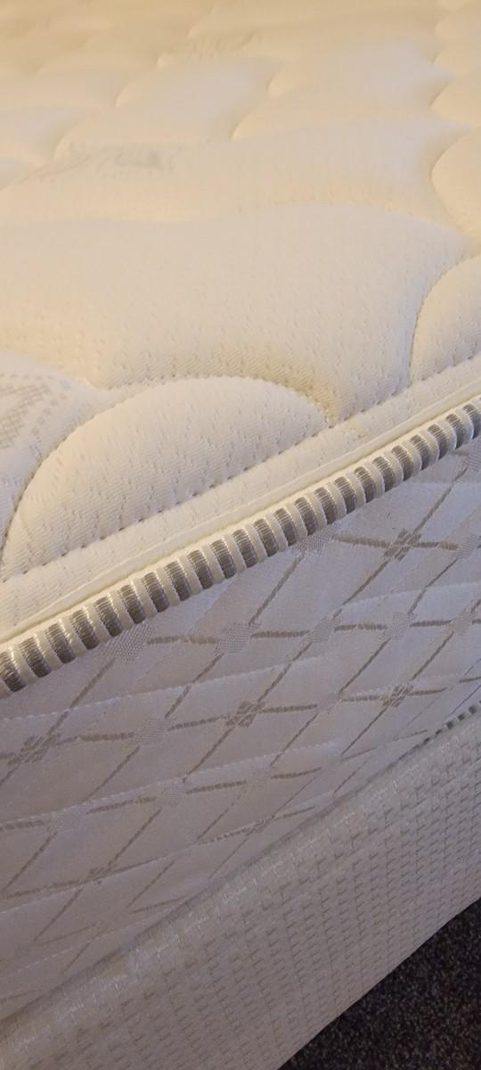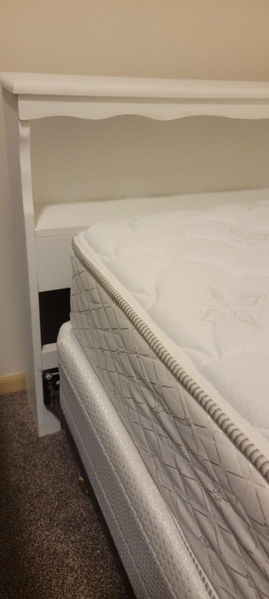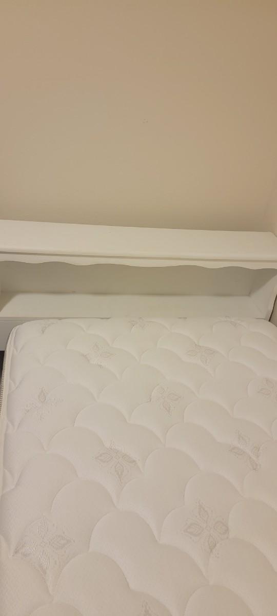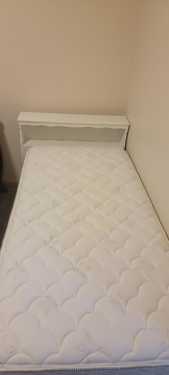 Twin bed mattress boxspring, white headboard has shelf and frame