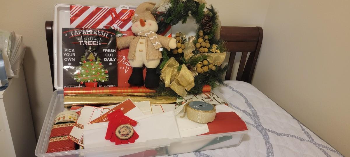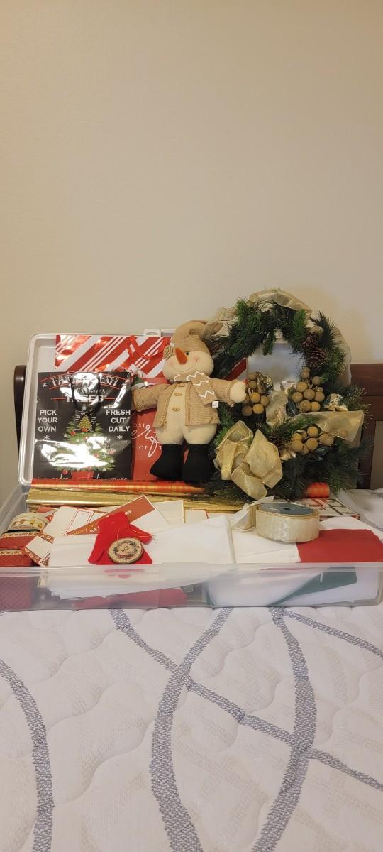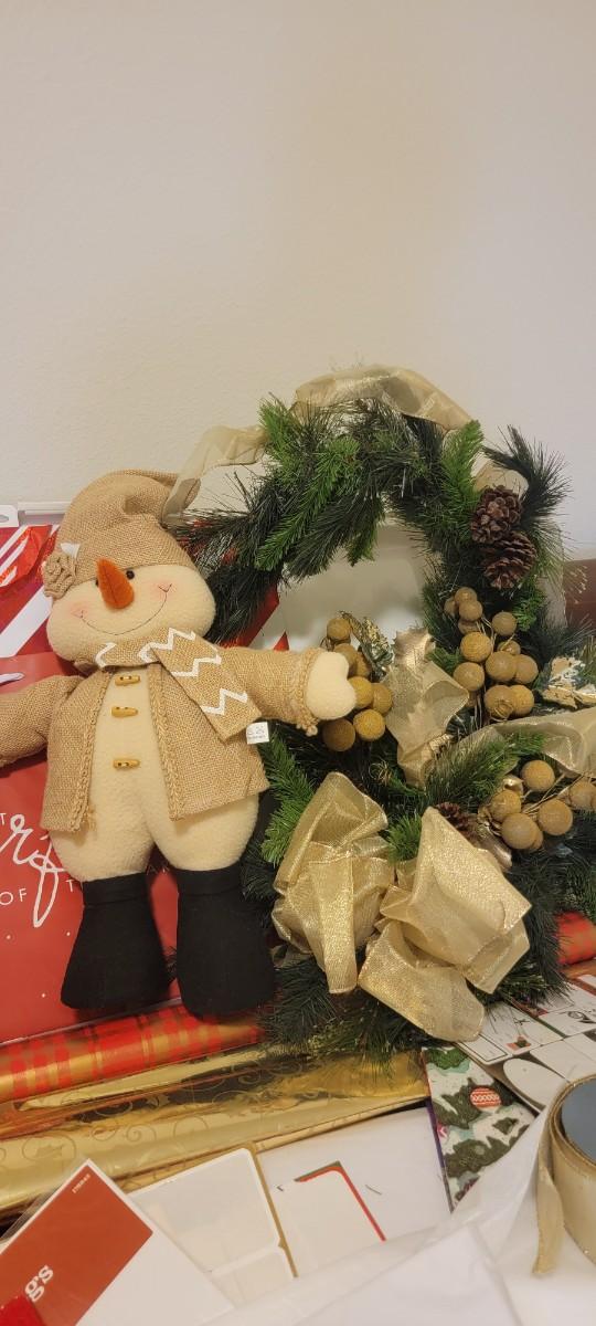 Tote of Christmas wrap, cute snowman stuffed, swag