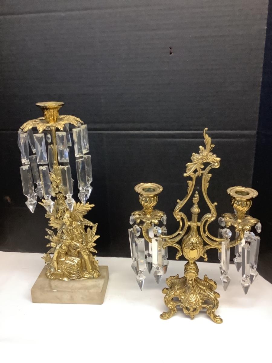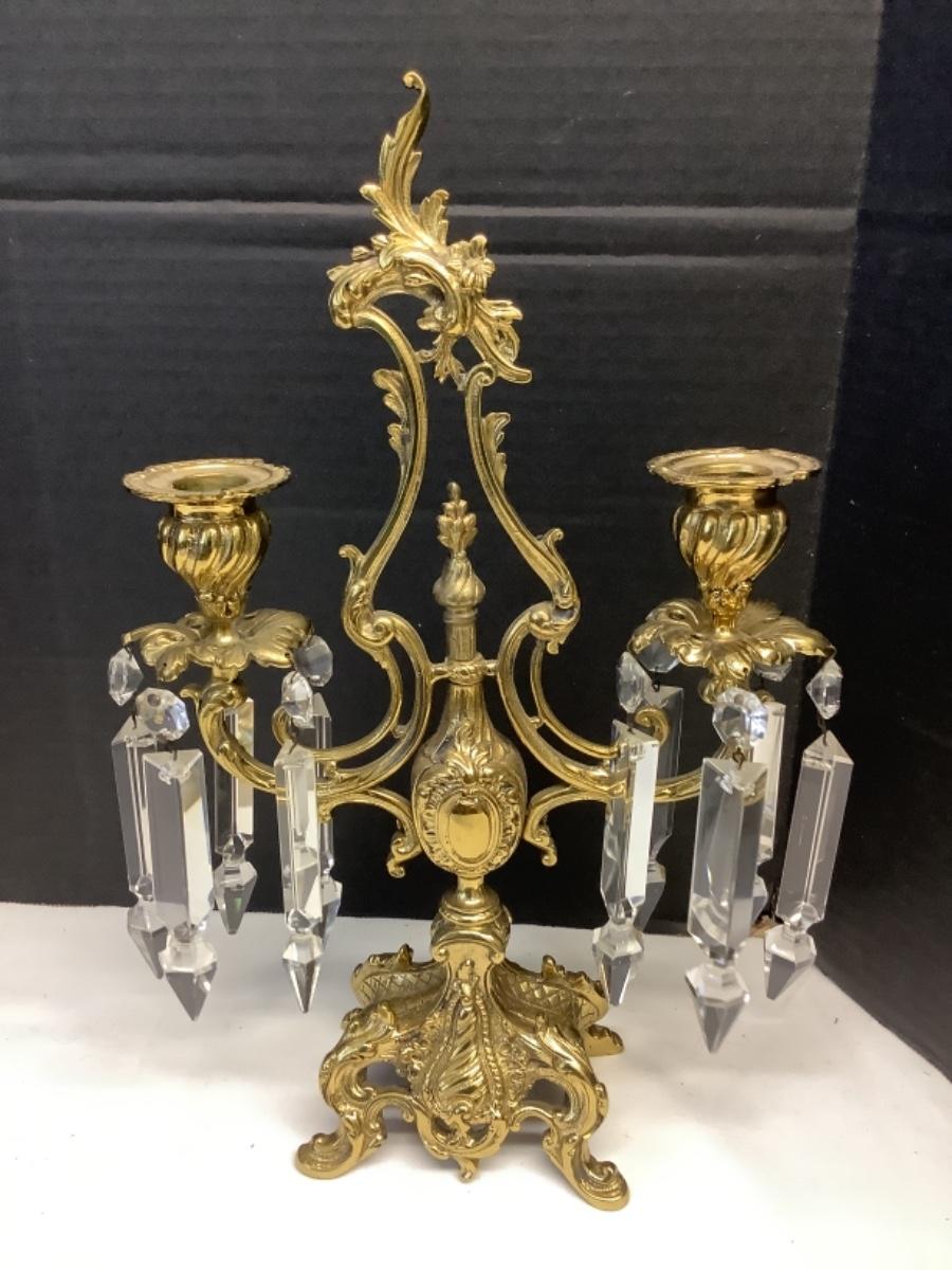 Double Candle Girandole measures 13-1/2” tall and 8-1/4” wide, this Girandole does sit a little crooked but still a beautiful piece, both items have hanging crystal prisms