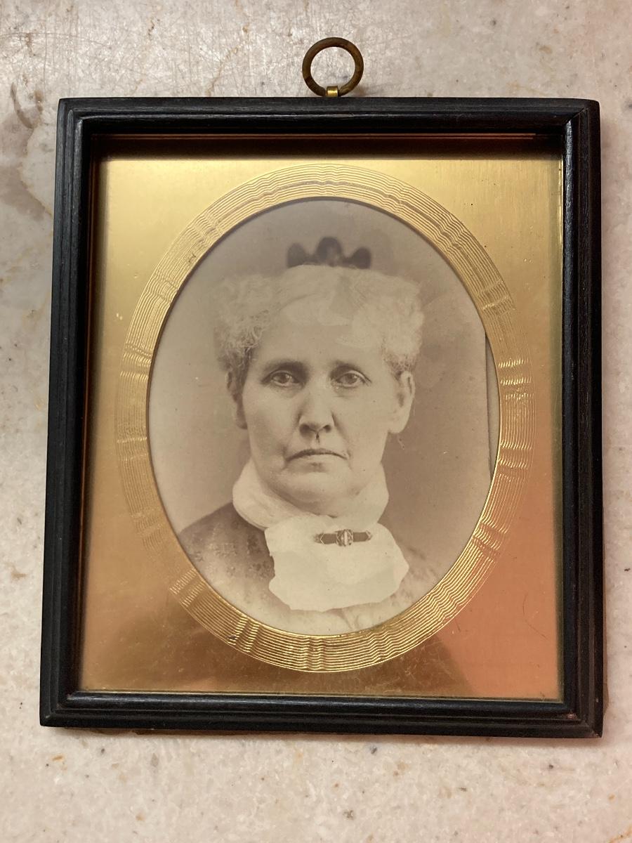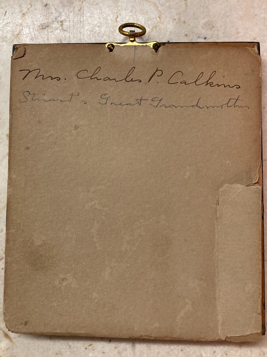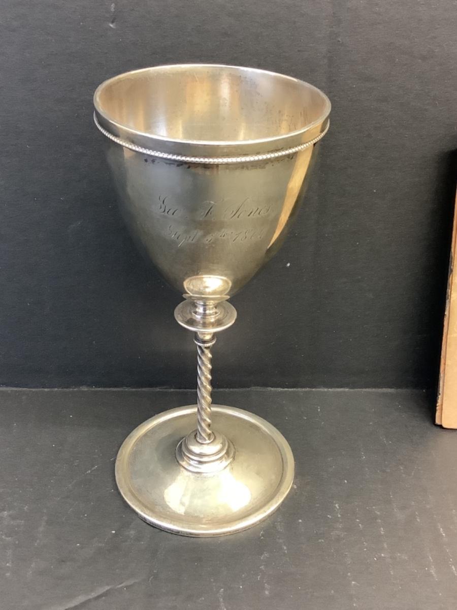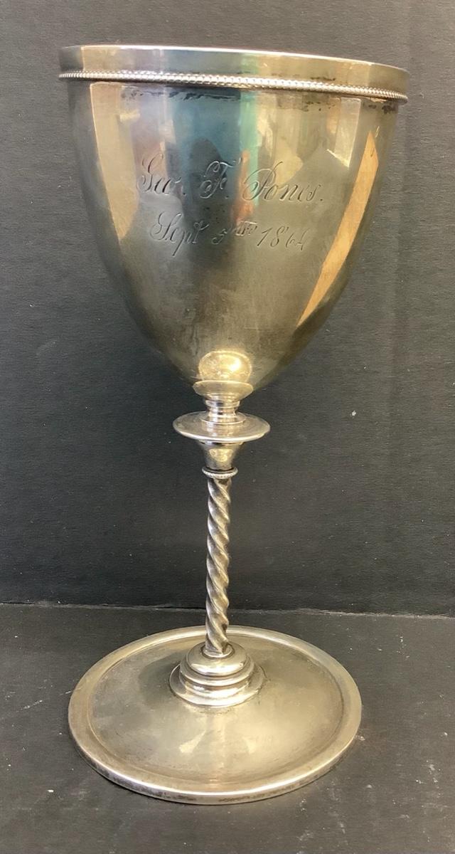 Antique Coin Silver goblet by Vanderslice Co. S.F. With two engravings one side is engraved Geo. F. Jones Sept. 5th 1864, the other side is engraved Geo. J Calkins Aug. 25-1897. Comes with antique framed photograph of Mrs. Charles P. Calkins