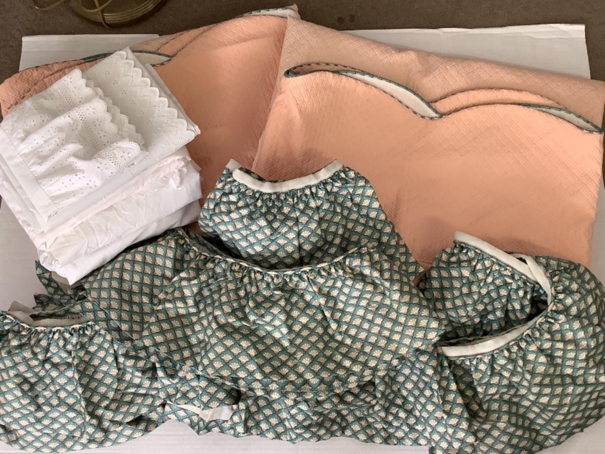 Pair of custom made twin bed spreads with detachable bed skirts, some fading on the bed spreads (see photos), twin bedding includes-2 fitted sheets, 2 flat sheets and 1 pillow case