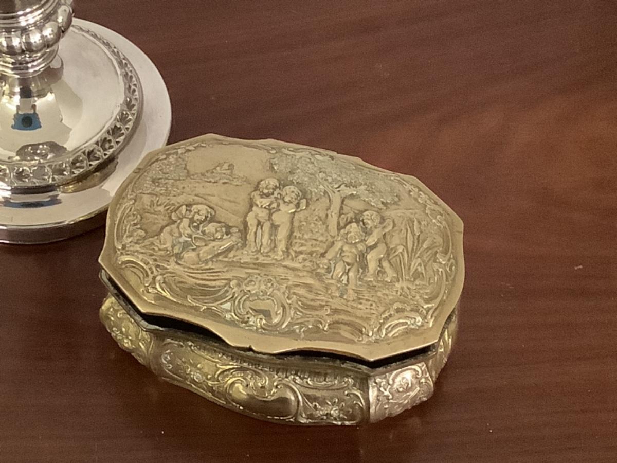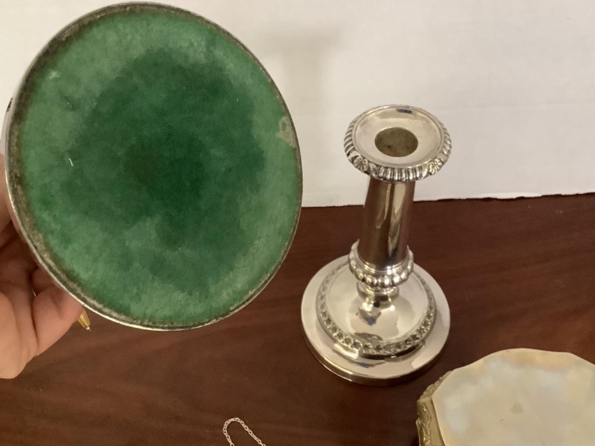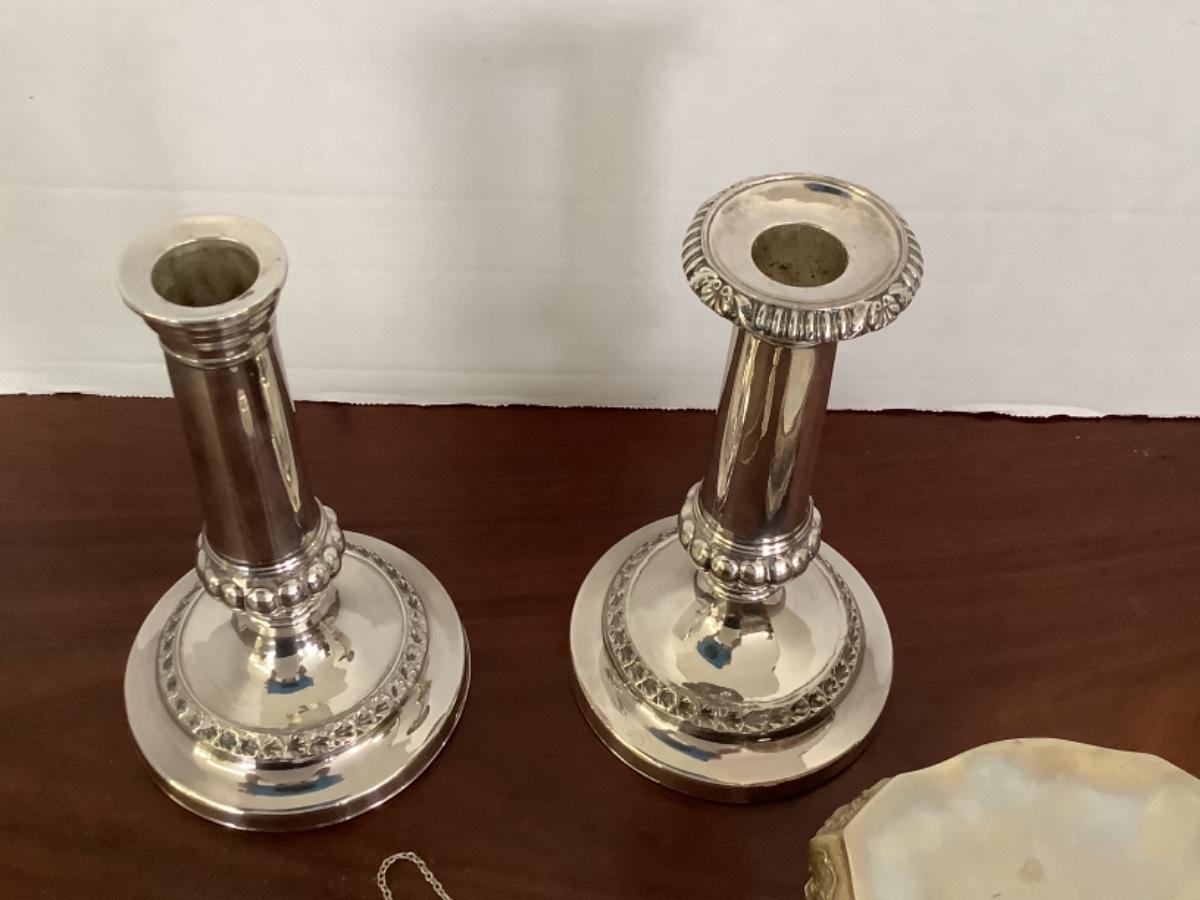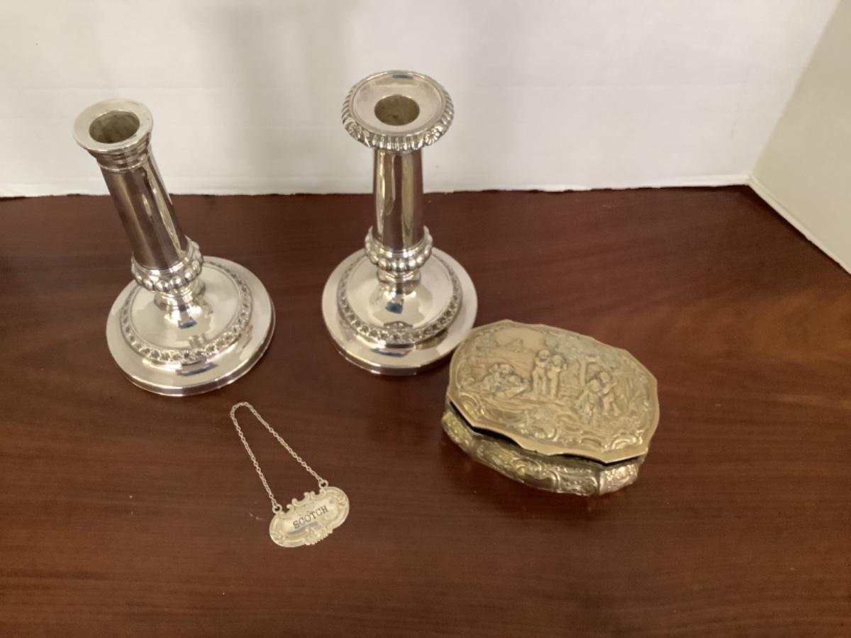 Pair of silver plate candlesticks measuring 7-1/2” tall, one is missing a bobeche, hinged box measures 2-1/2” high 5” wide and 3-1/2” deep and one sterling silver hanging scotch label