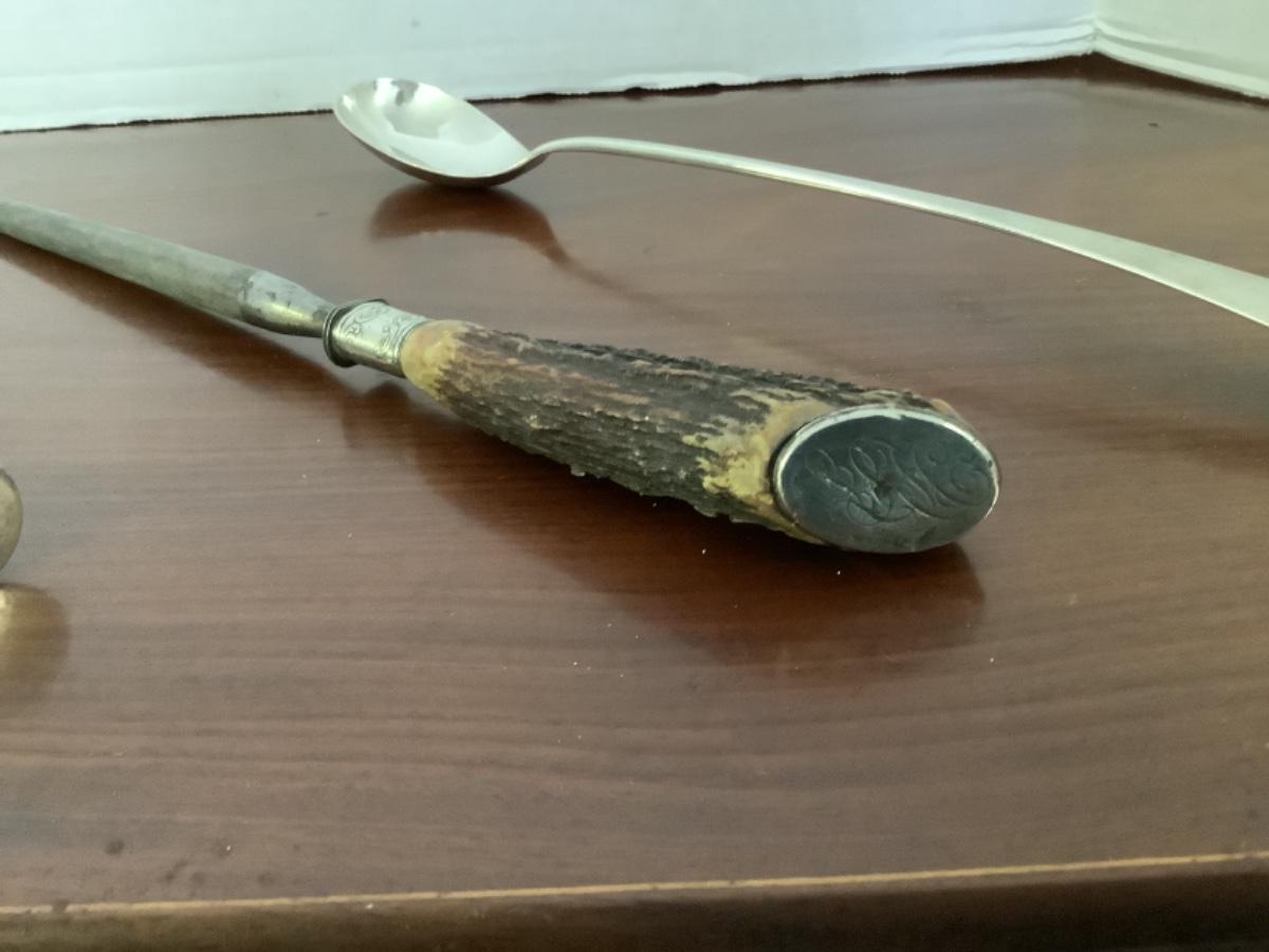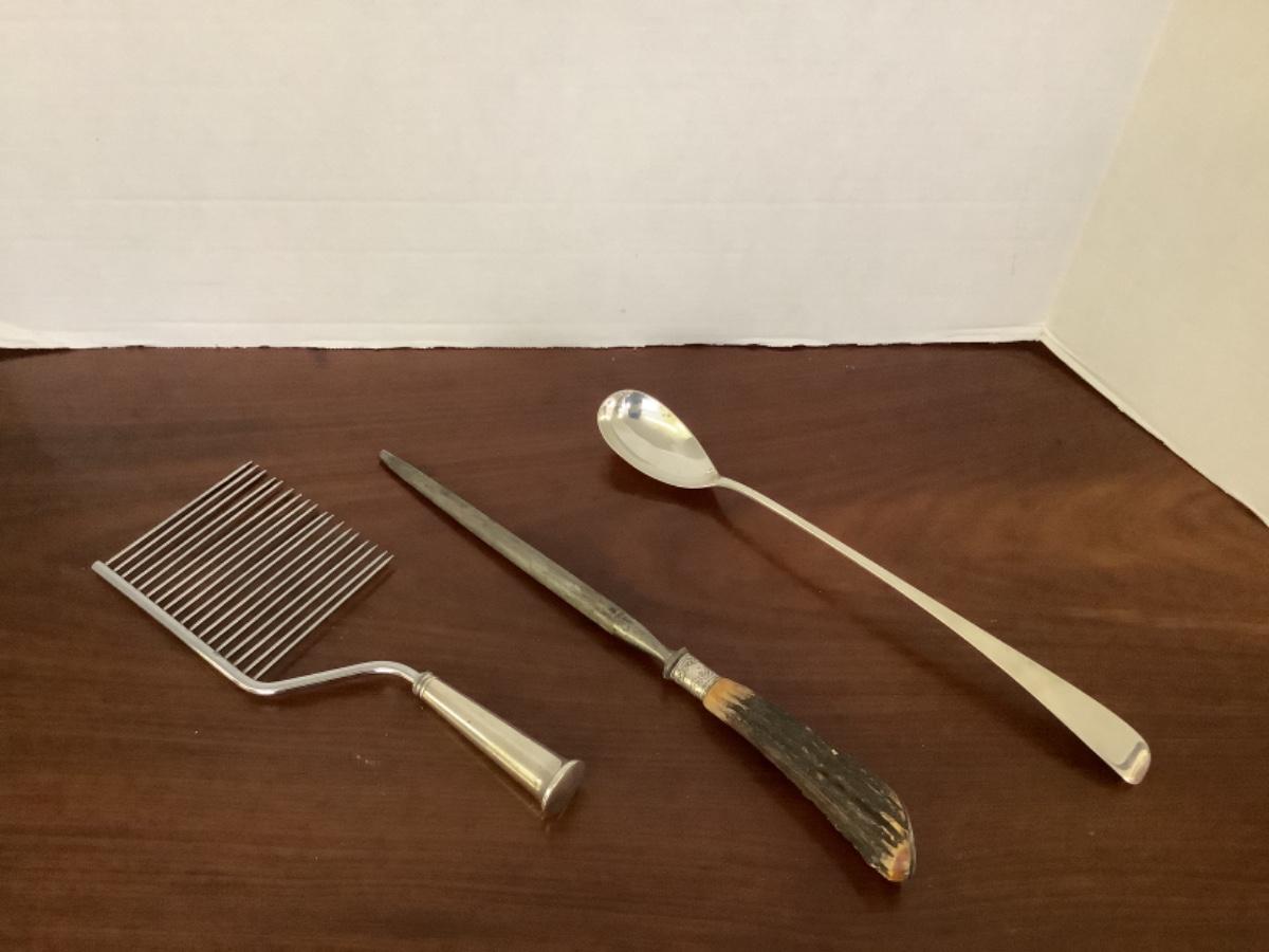 Ericksen Sterling Silver stuffing spoon, Horn handle sharpener with sterling silver band and end and cake breaker with sterling silver handle
