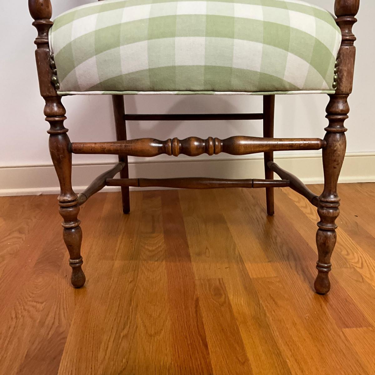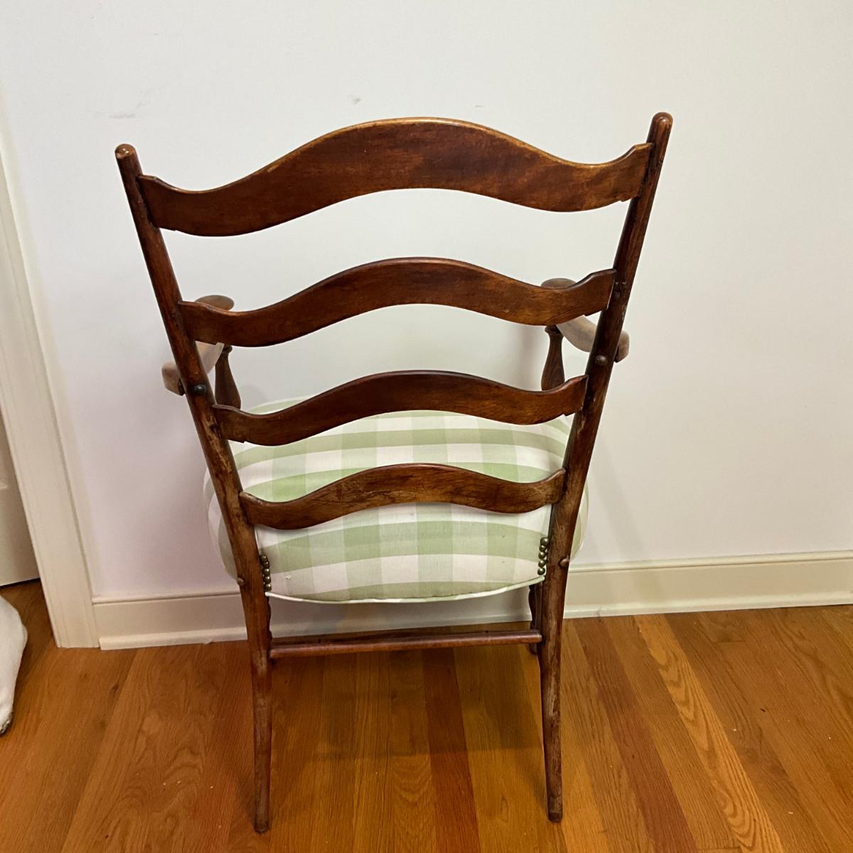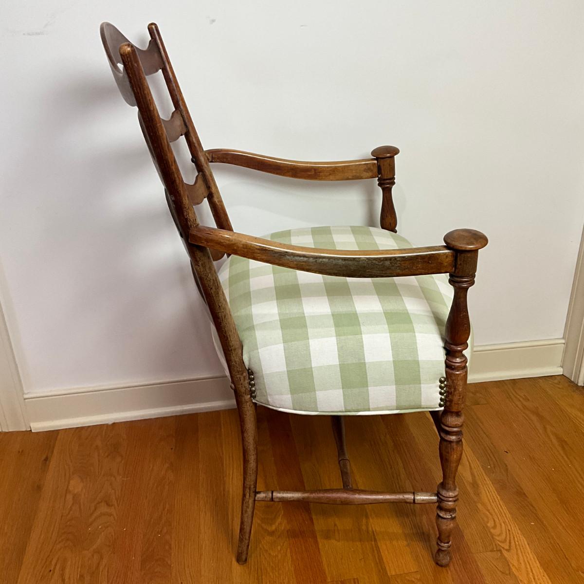 B227 Antique Rush Seat Stool & Ladder Back Arm Chair With Green & White Gingham Cushion