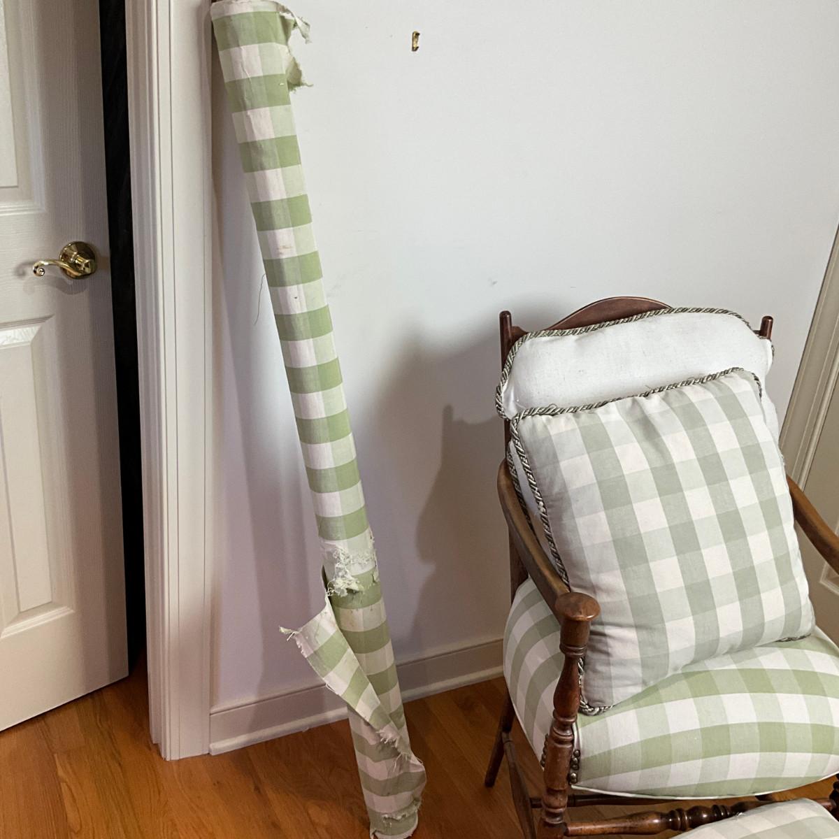 Two seat cushions that are matching, one fitted cushion, comes with extra fabric