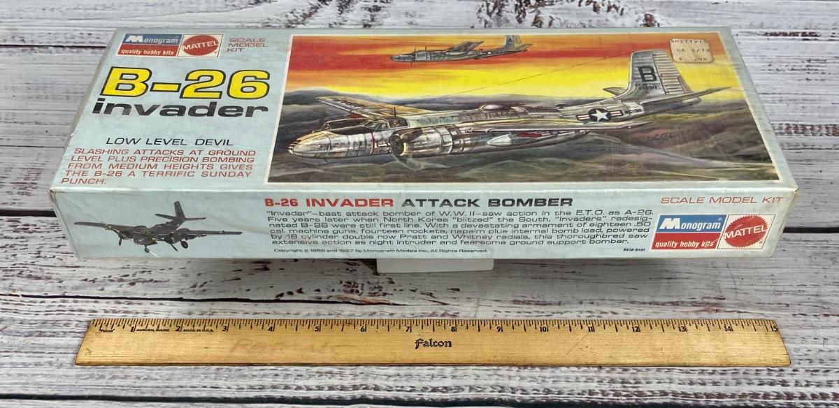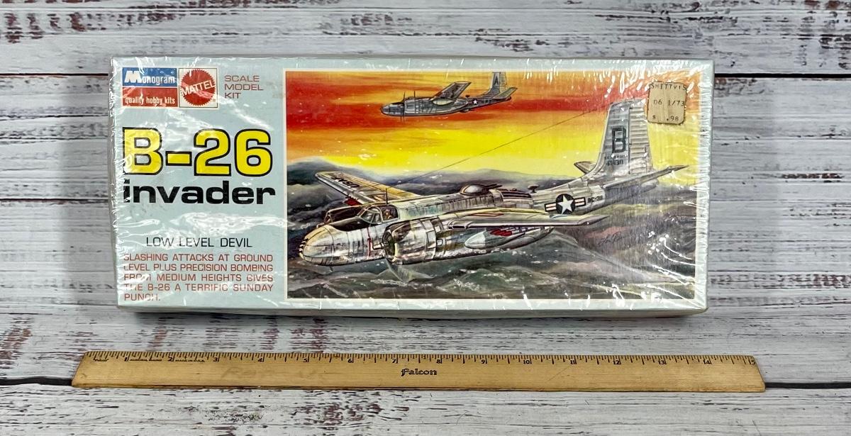 B-26 Invader model kit from Monogram. Unopened, shrink wrapped original box. Kit from 1967, originally released in 1958.