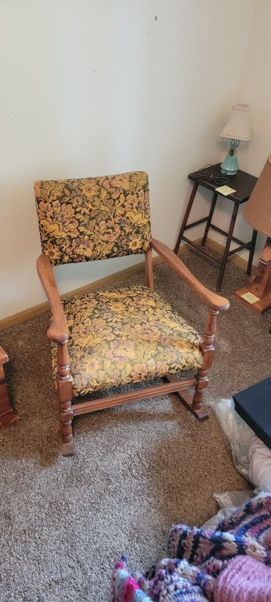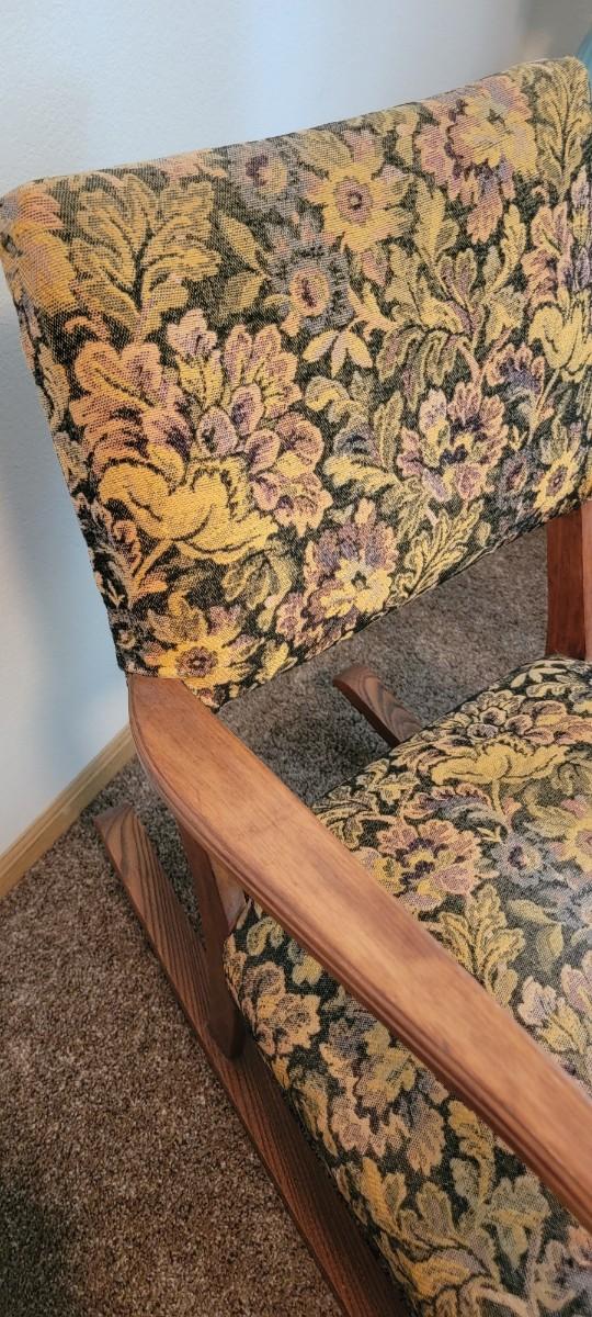 Vintage rocking chair wood and upholstered. Seat 16" H 31" to top of back