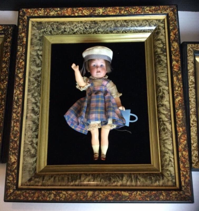 Three framed antique dolls. Two German dolls 8” and 6” tall with Bisque head, signed on back of neck composition body, glass teeth and eyes. One Bisque doll