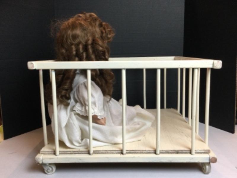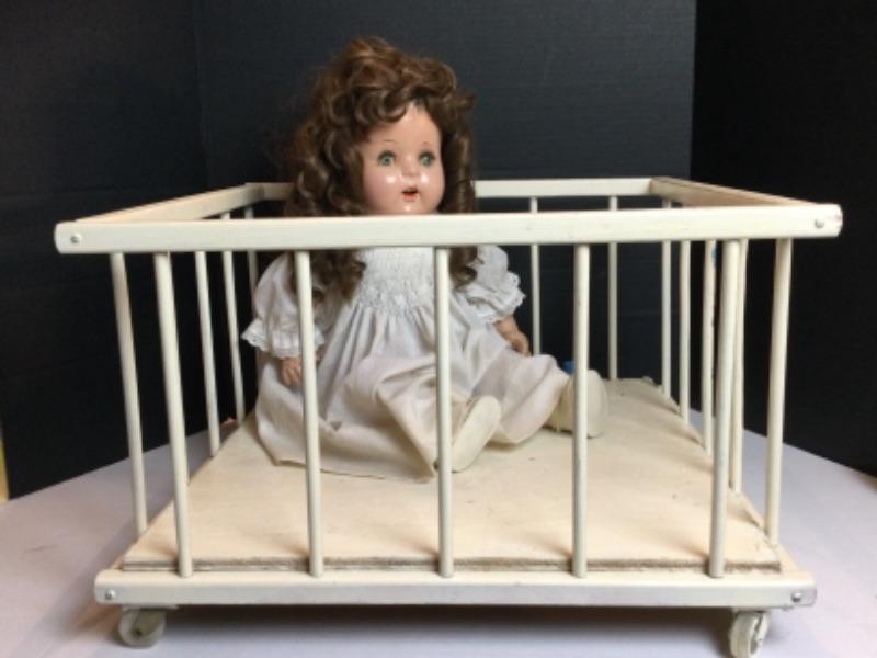 Antique ideal baby doll, she has a voice box that is not working. composition body, teeth, open mouth,and moving eyes. Is originally shown without hair Measures 22”. Antique doll playpen on wheels