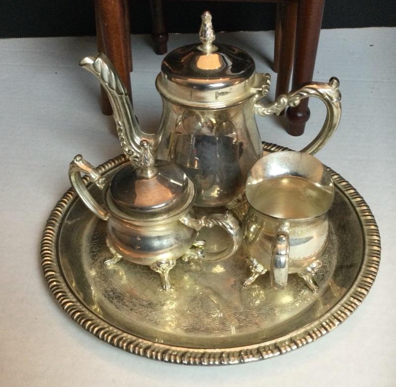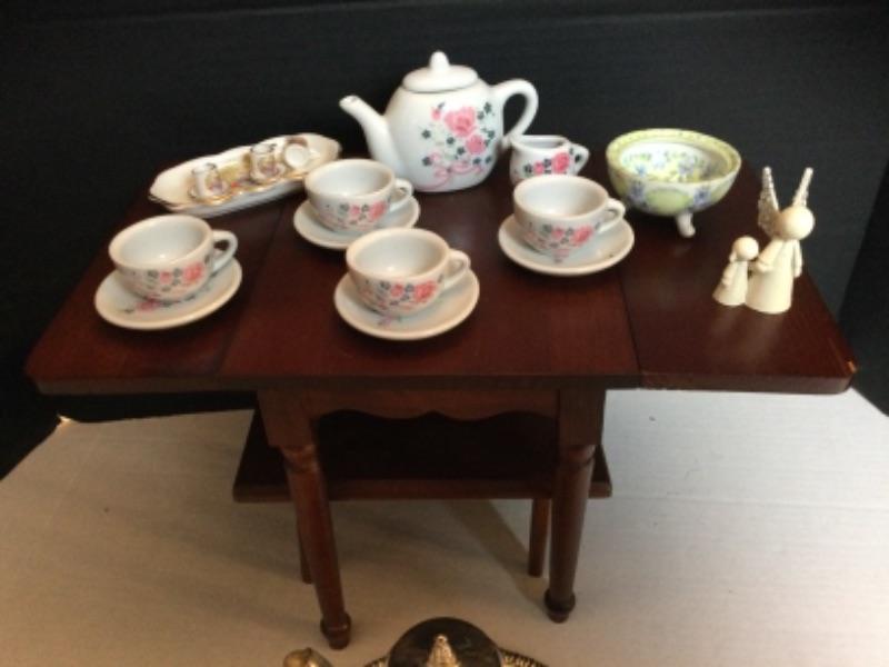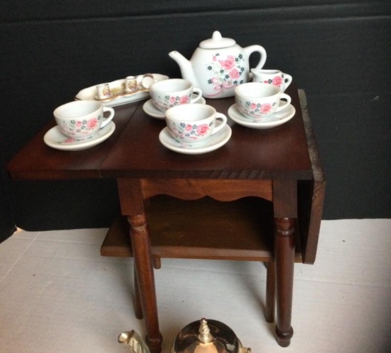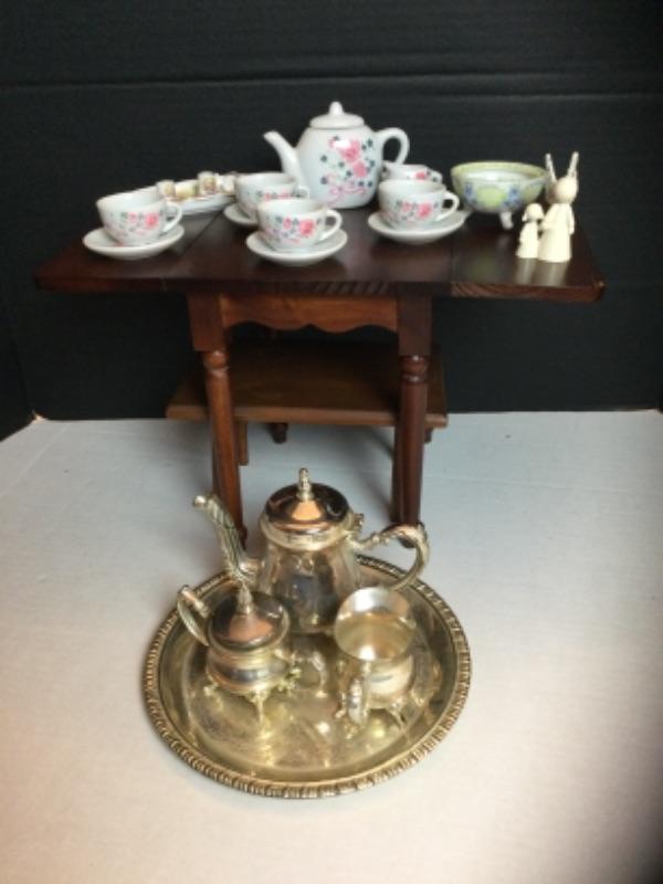 Wood drop leaf dolls table with bench. Porcelain tea set by Battat. Silver plate tea pot, cream , sugar and tray