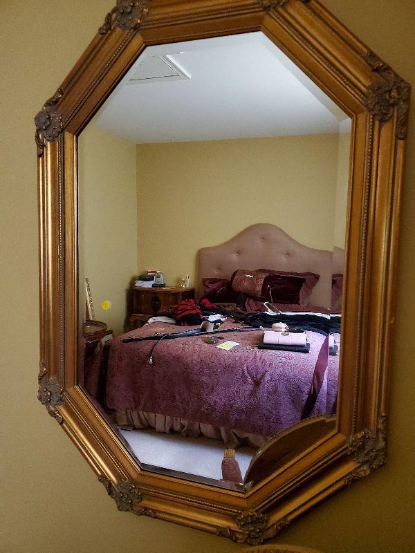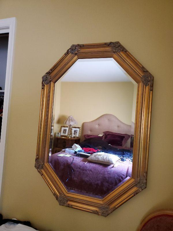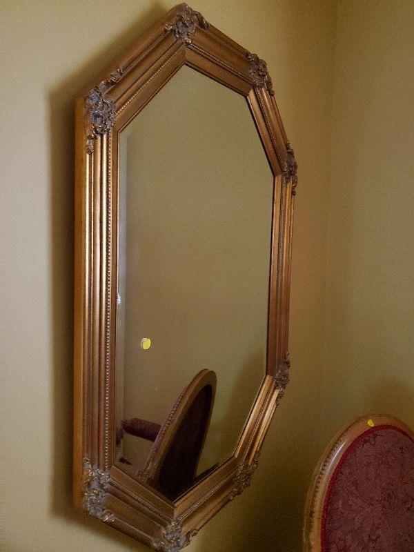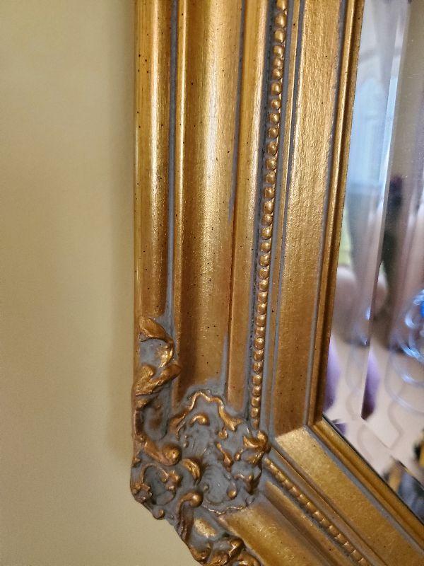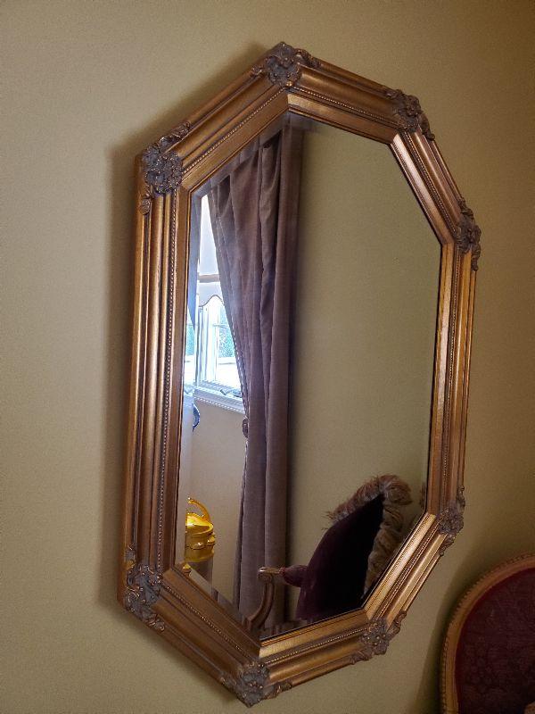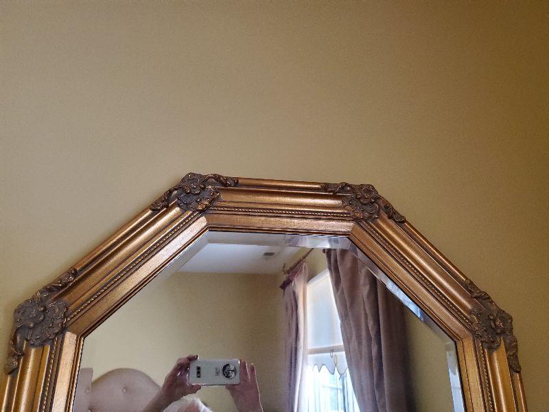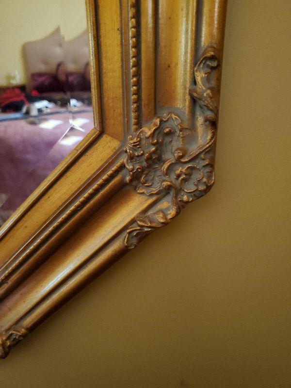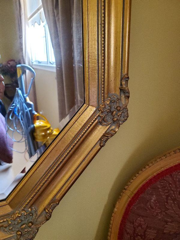Oval Mirror with vintage look, carved floral edges. Measures 40 x 28 inches. Please see pictures for details on mirror and condition.