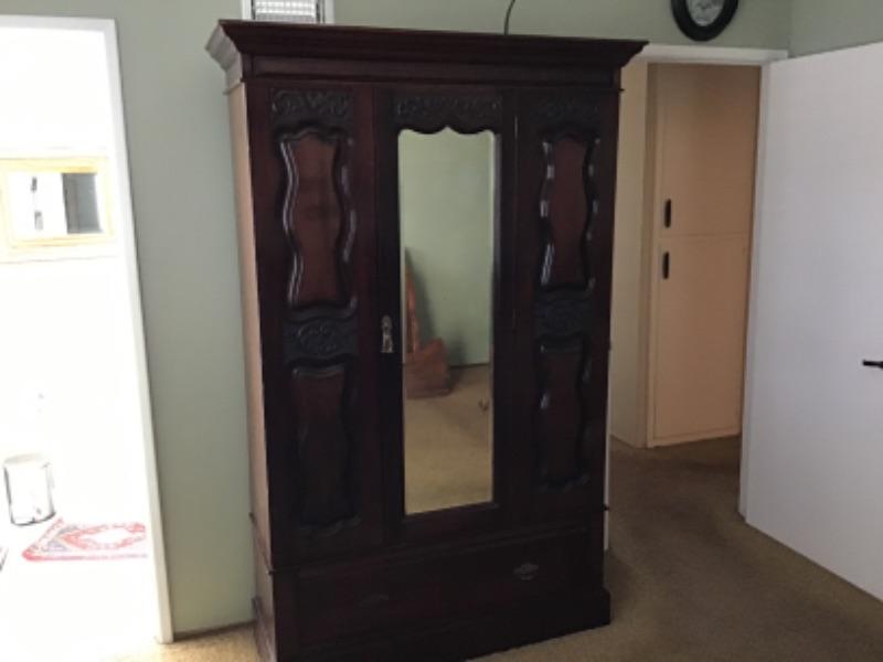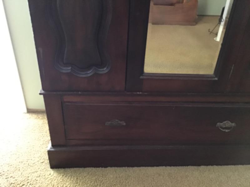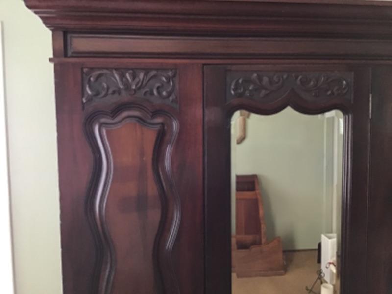 Antique armoire nicely carved with beveled mirror. Proximately 50 inches across 18 inches do you.