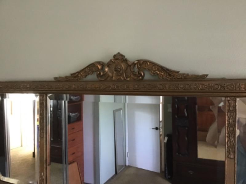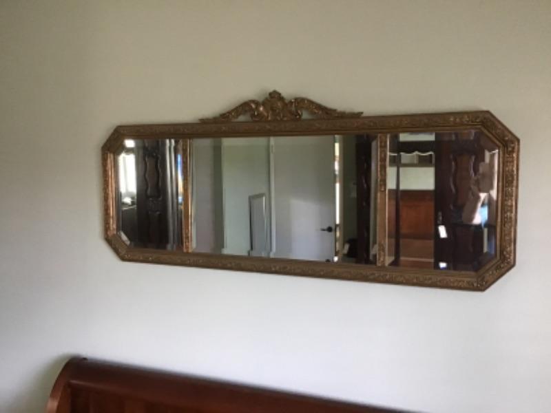Antique gold guilt beveled mirror. Measures approximately 54 inches why by 23 inches high