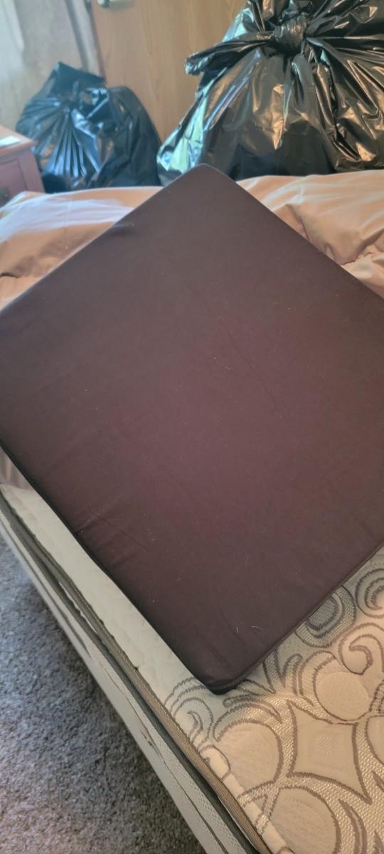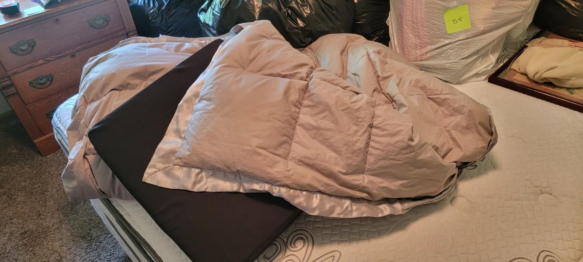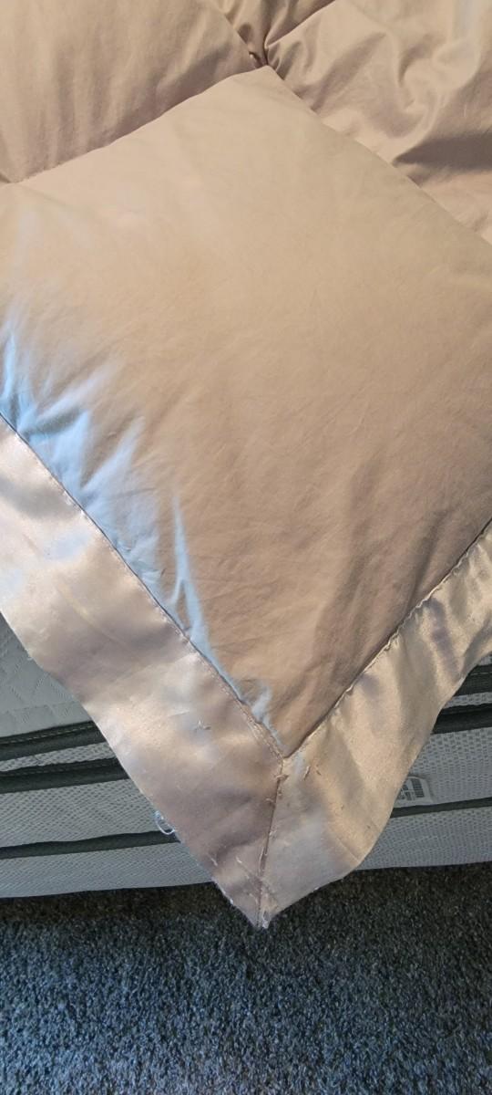 Comforter gray 96" x 96" appears to be down no label and black cushion